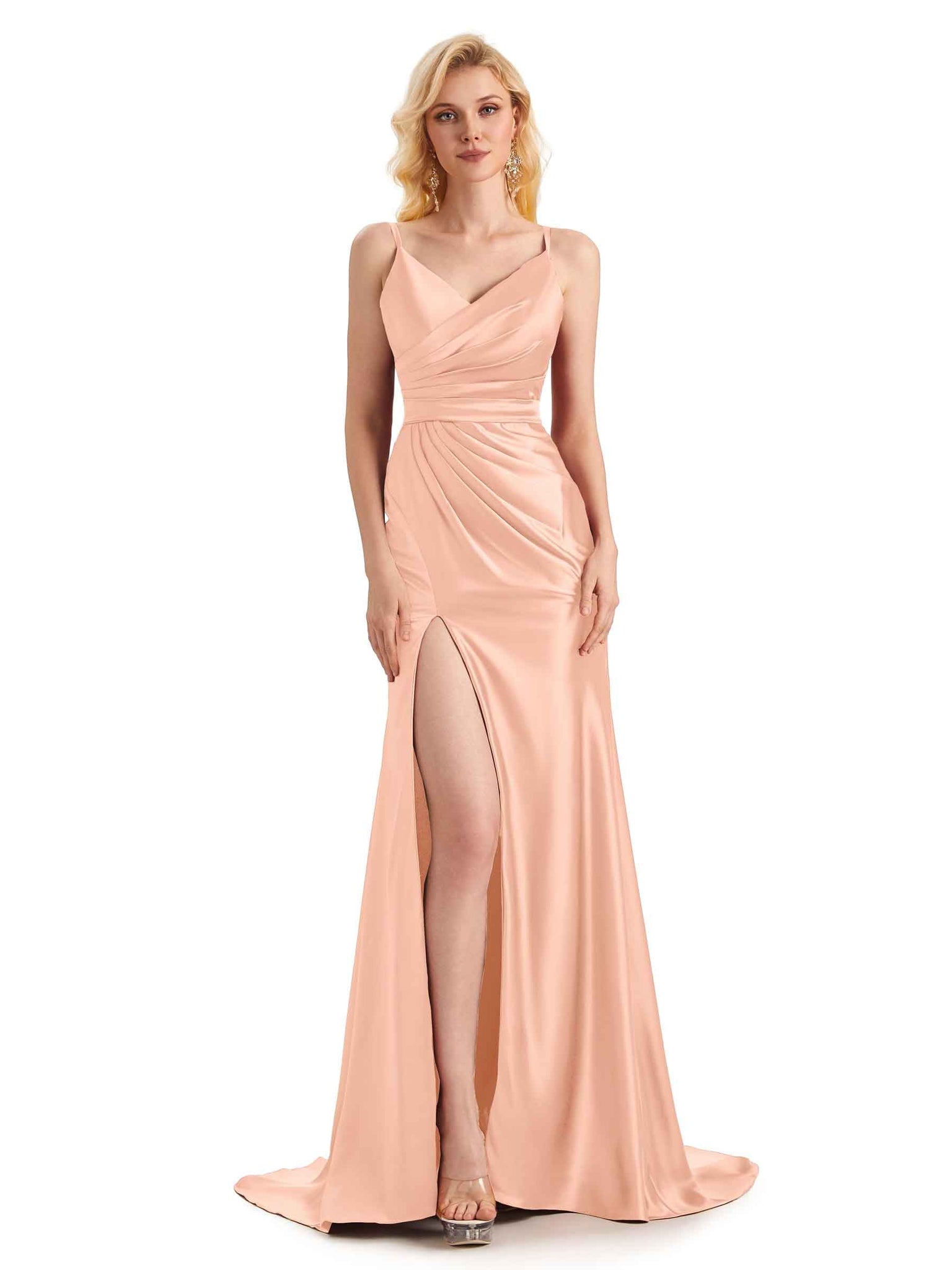 Sexy Side Slit V-Neck Spaghetti Straps Satin Wedding Guest Dresses Online - ChicSew – ChicSew