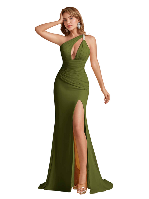 Sexy Soft Satin One Shoulder Mermaid Side Slit Ruched Floor Length Bridesmaid Dresses - ChicSew – ChicSew