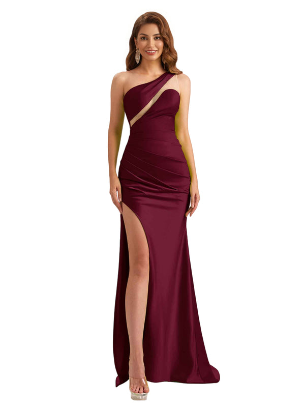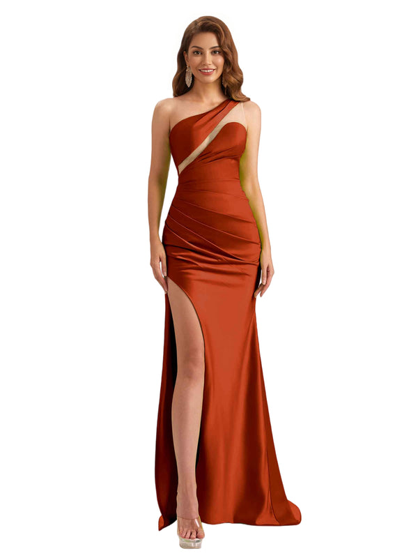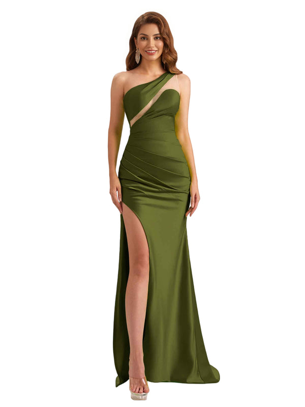 Sexy Silky Satin One Shoulder Mermaid Side Slit Unique Long Bridesmaid Dresses Online
