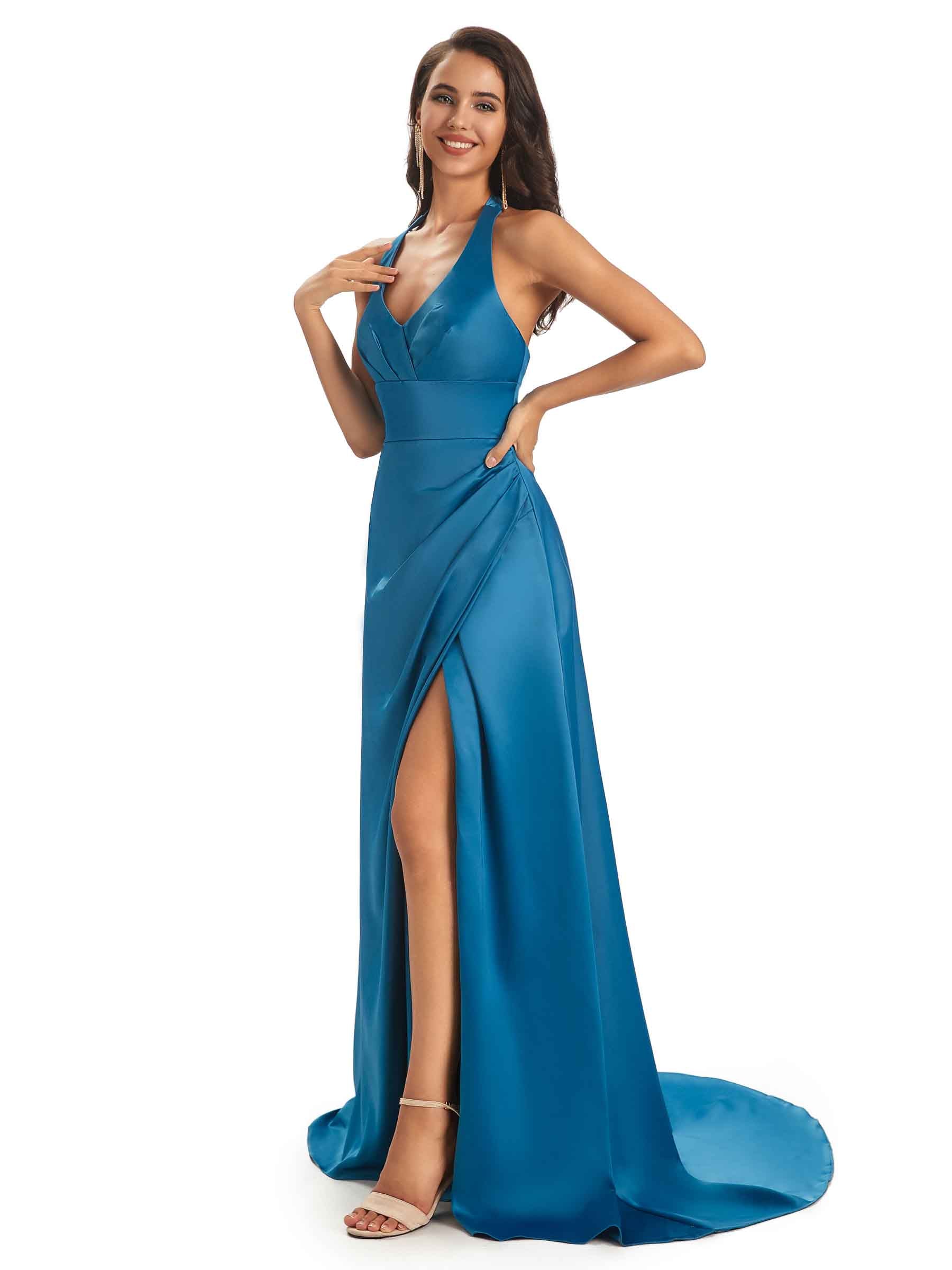 Sexy Soft Satin Side Slit Halter Floor-Length Long Bridesmaid Dresses Online