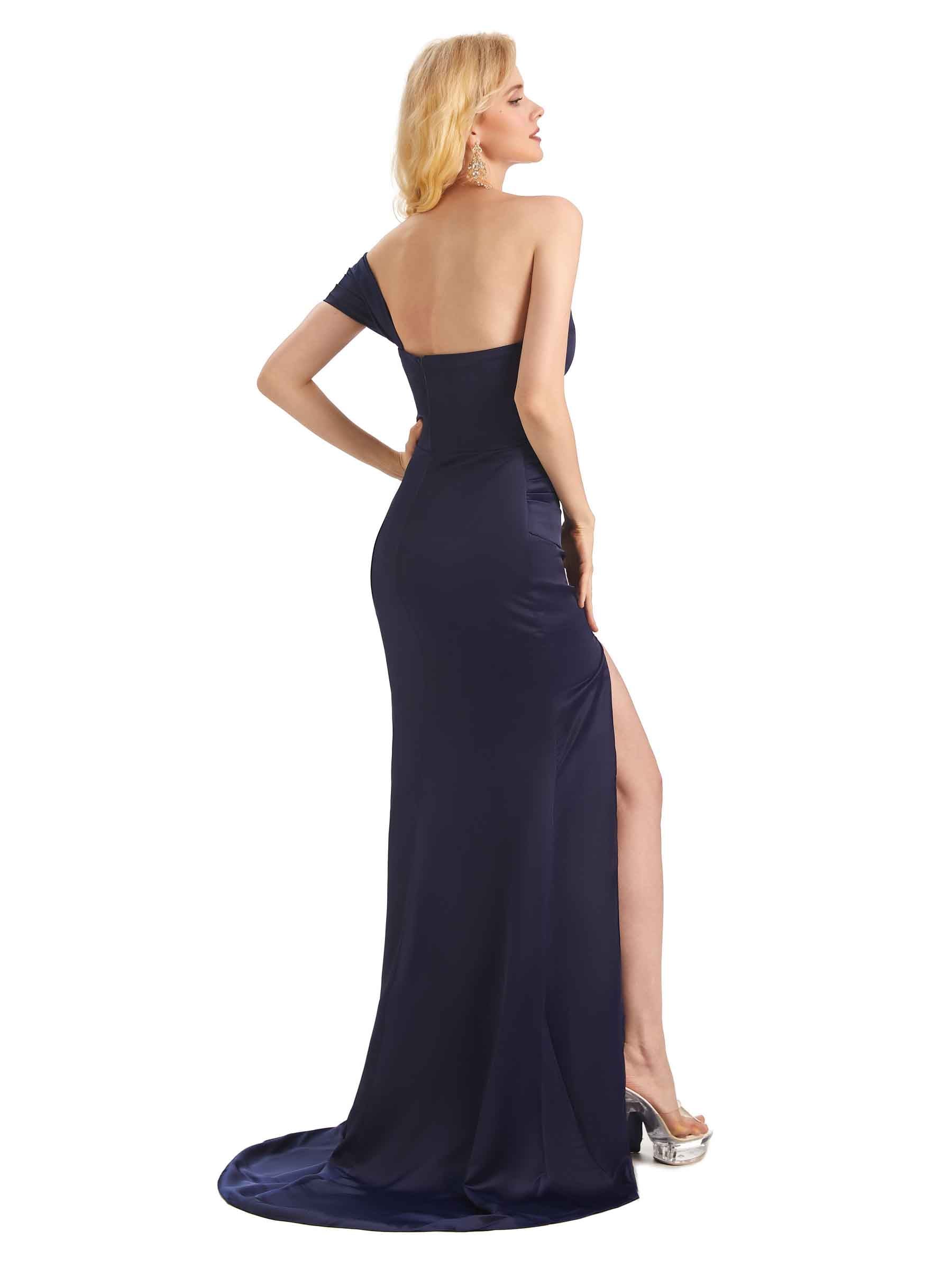 Sexy Soft Satin Side Slit Mermaid One Shoulder Long Wedding Guest Dresses Online
