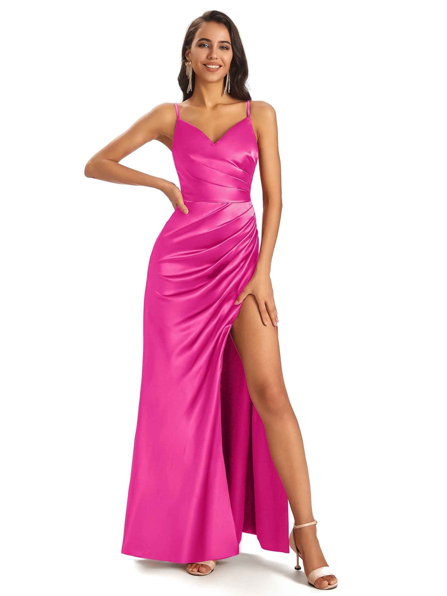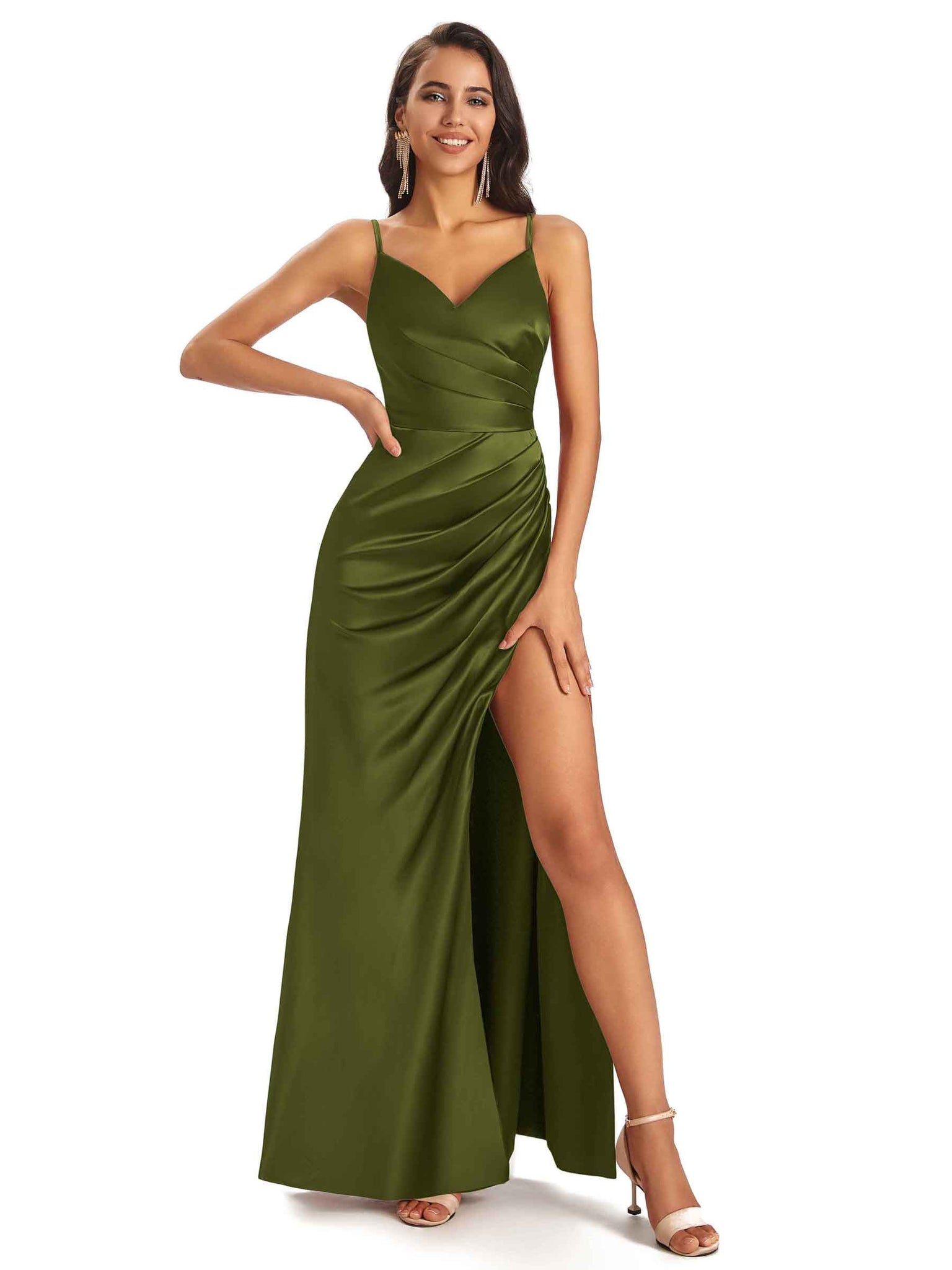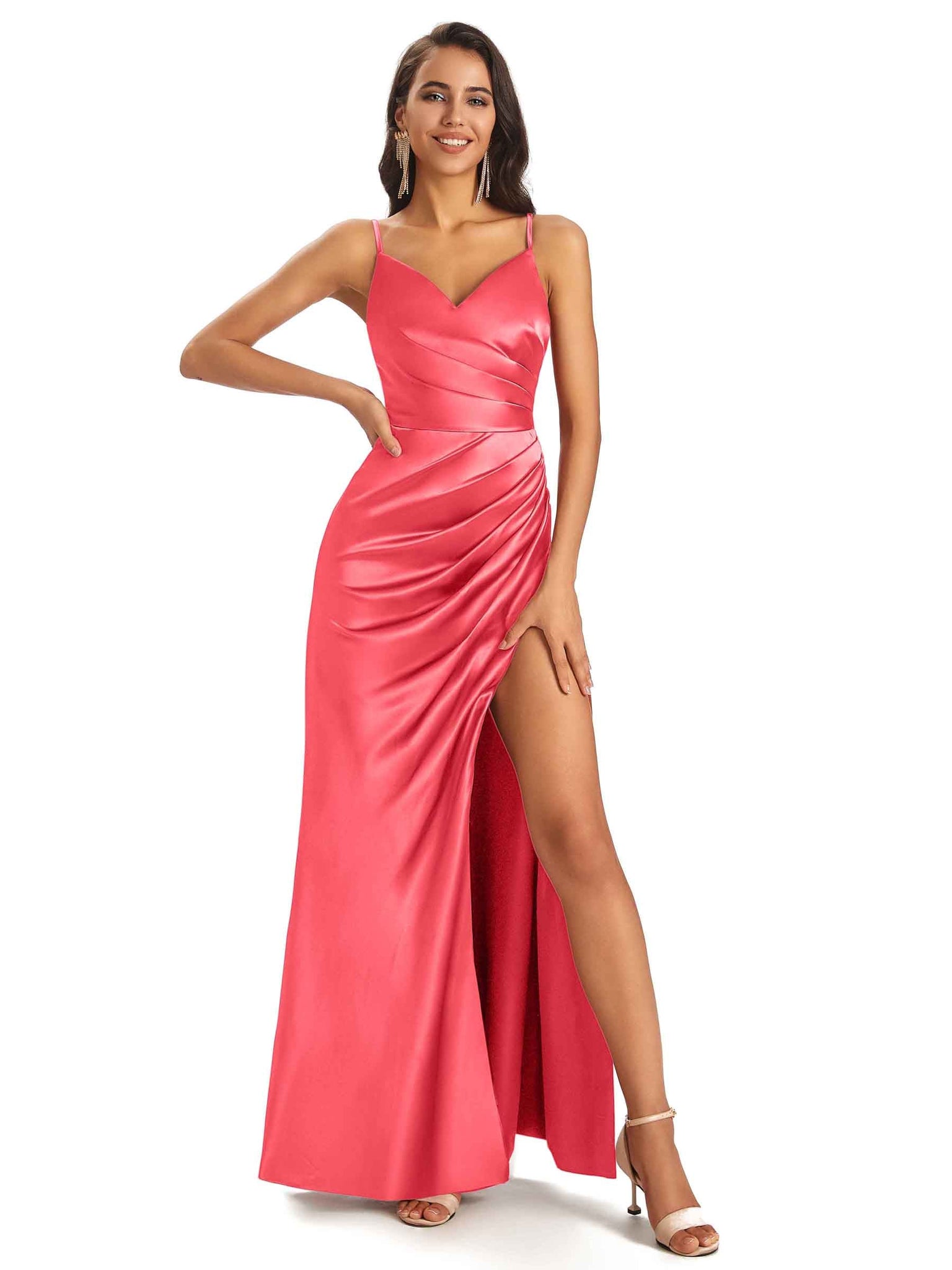 Sexy Ruched Satin Long Unique Formal Dresses For Women V-Neck Spaghetti Straps Side Slit