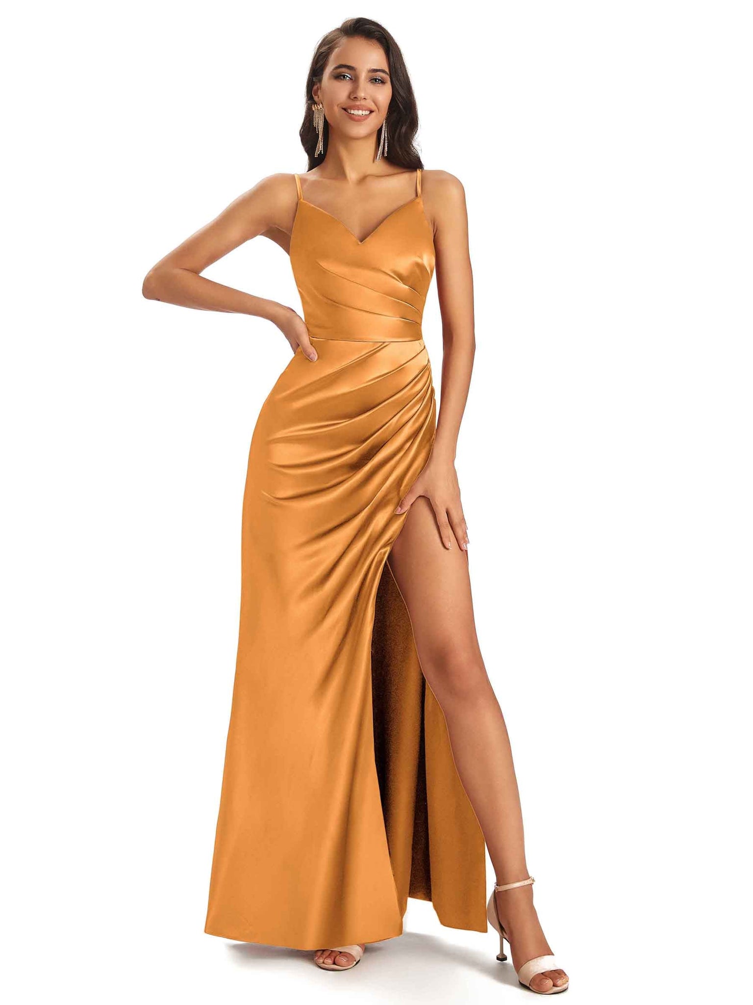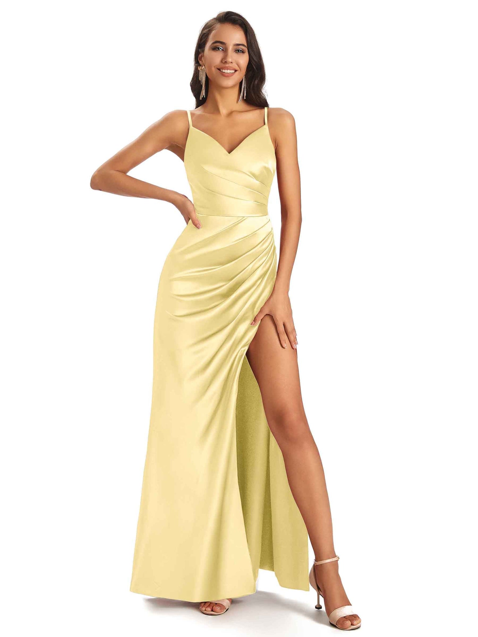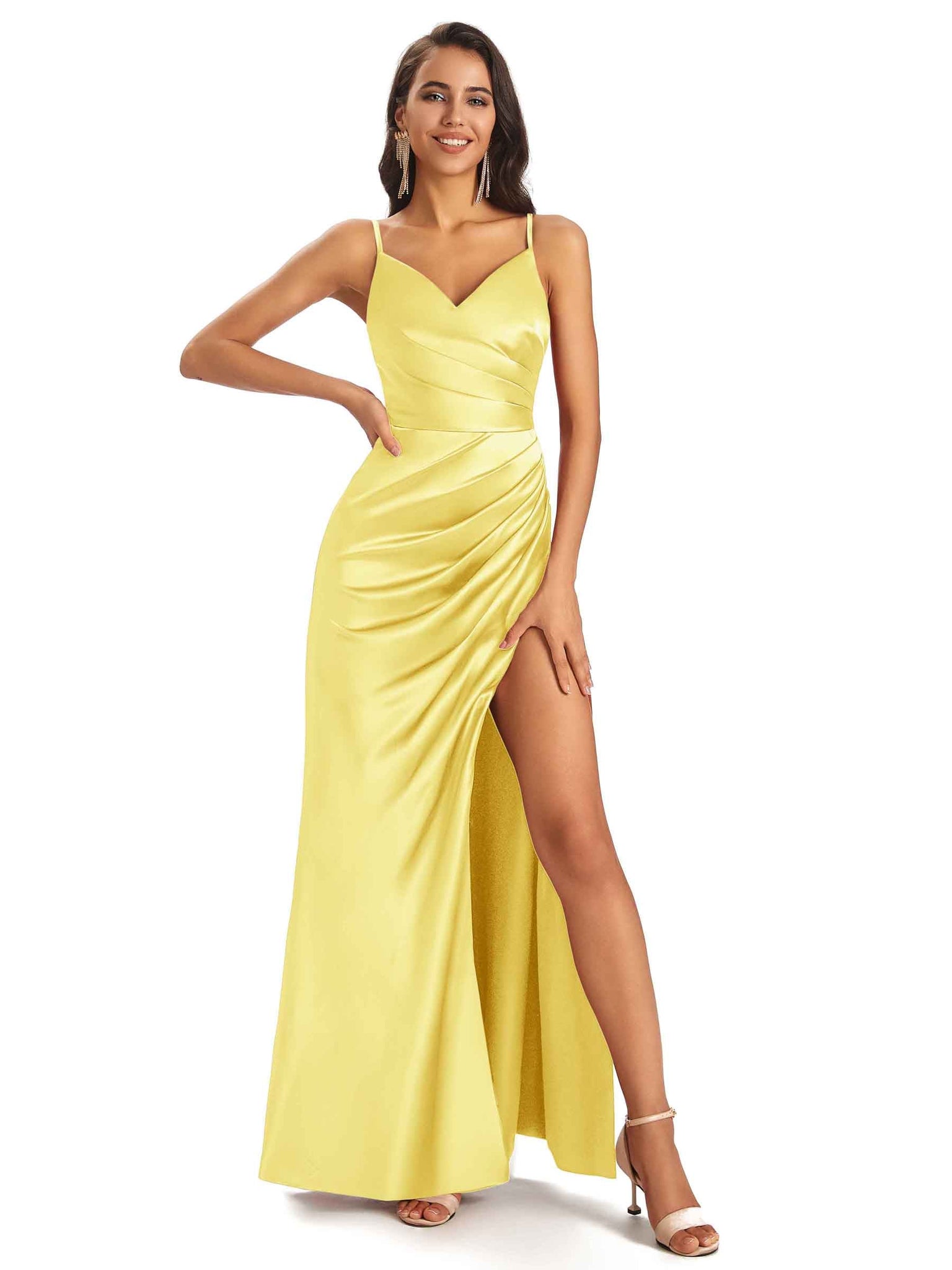 Sexy Ruched Satin Long Unique Formal Dresses For Women V-Neck Spaghetti Straps Side Slit