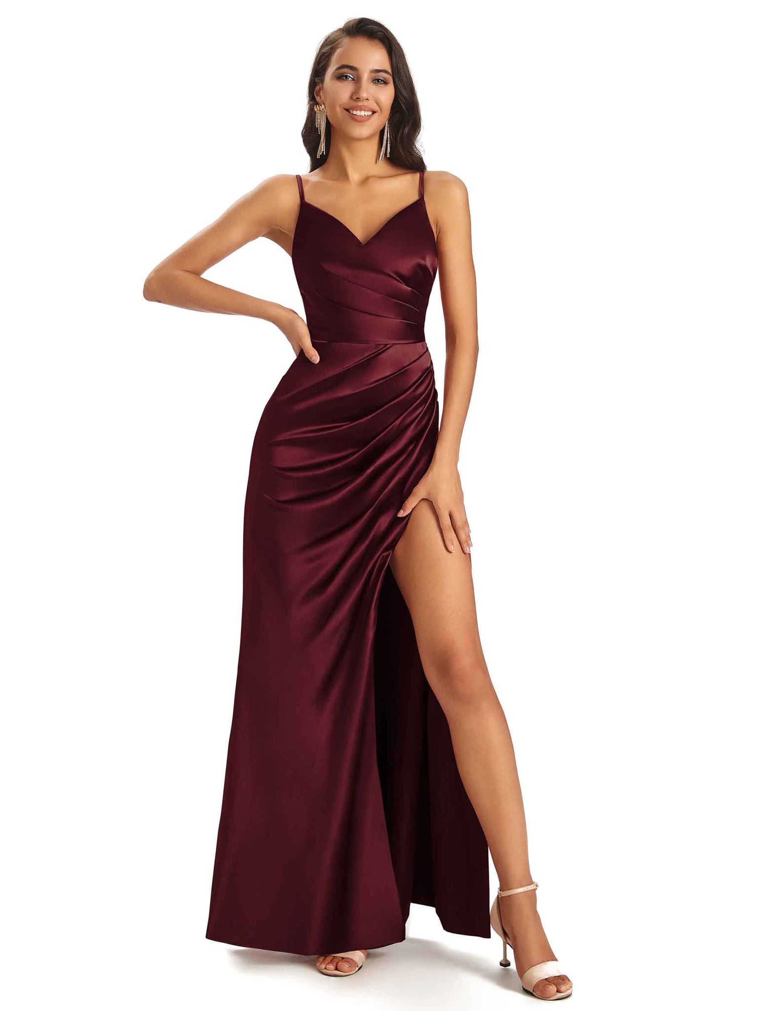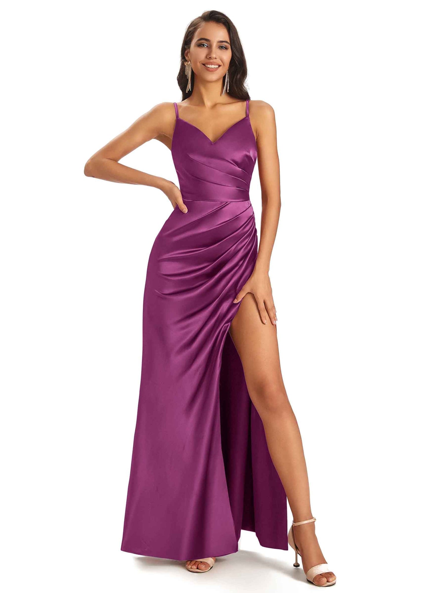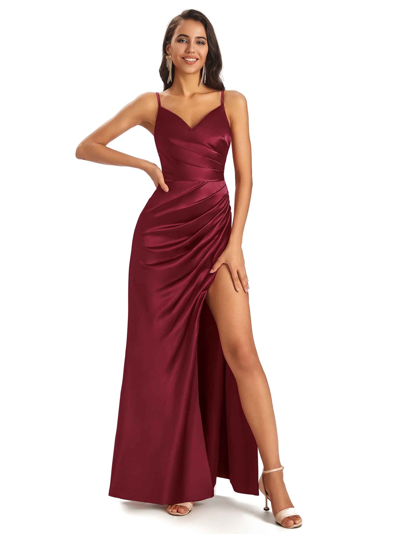 Sexy Soft Satin V-Neck Spaghetti Straps Side Slit Long Wedding Bridesmaid Dresses Online - ChicSew – ChicSew
