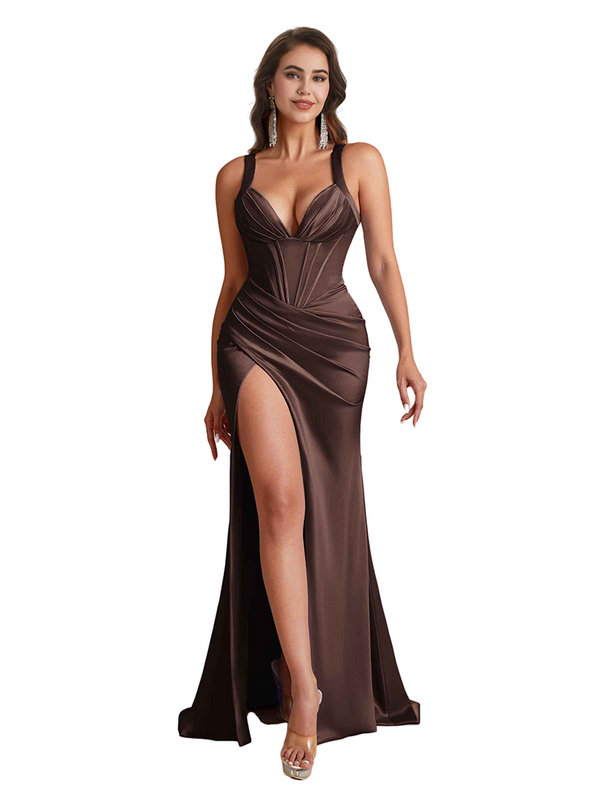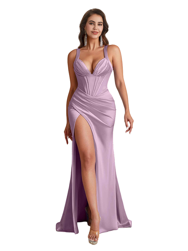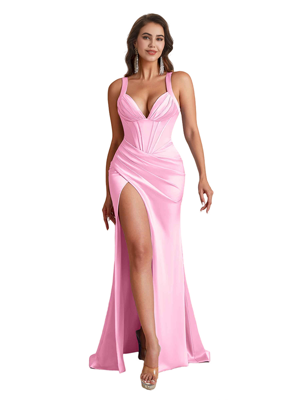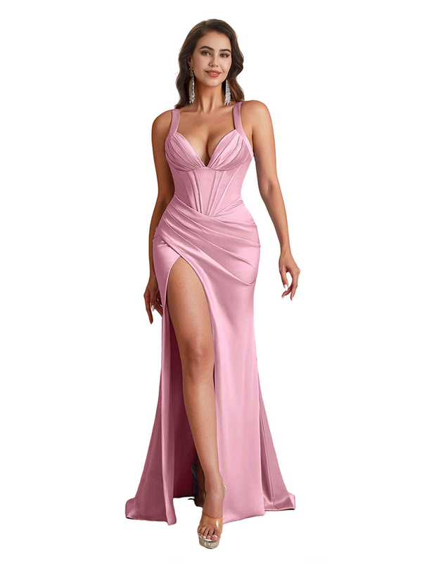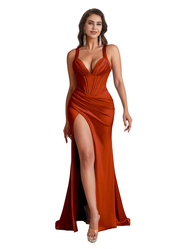 Sexy Spaghetti Straps Mermaid Soft Satin Unique Long Bridesmaid Dresses Side Slit - ChicSew – ChicSew