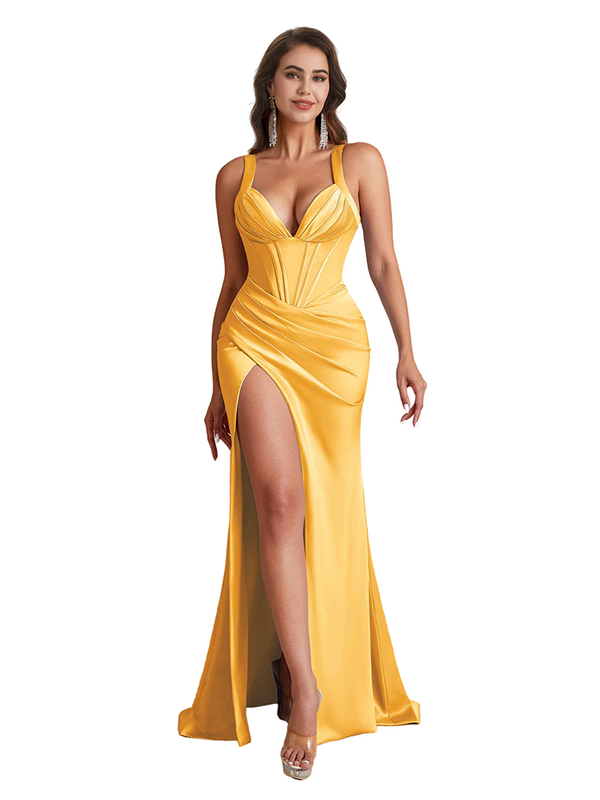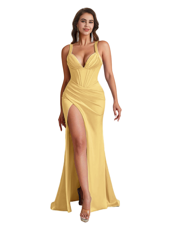 Sexy Spaghetti Straps Mermaid Soft Satin Unique Long Bridesmaid Dresses Side Slit