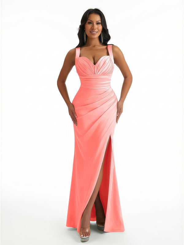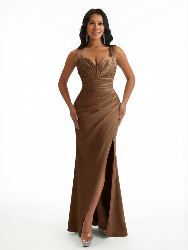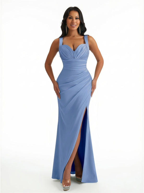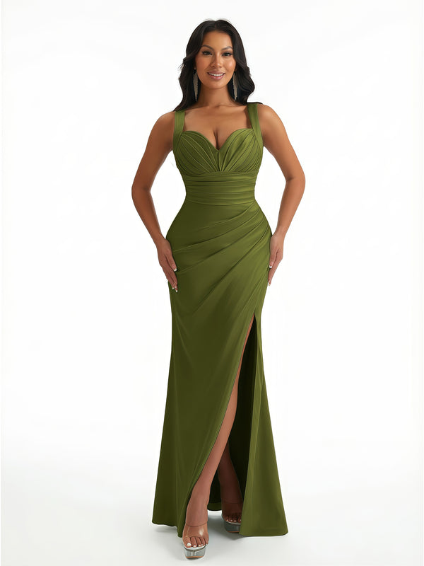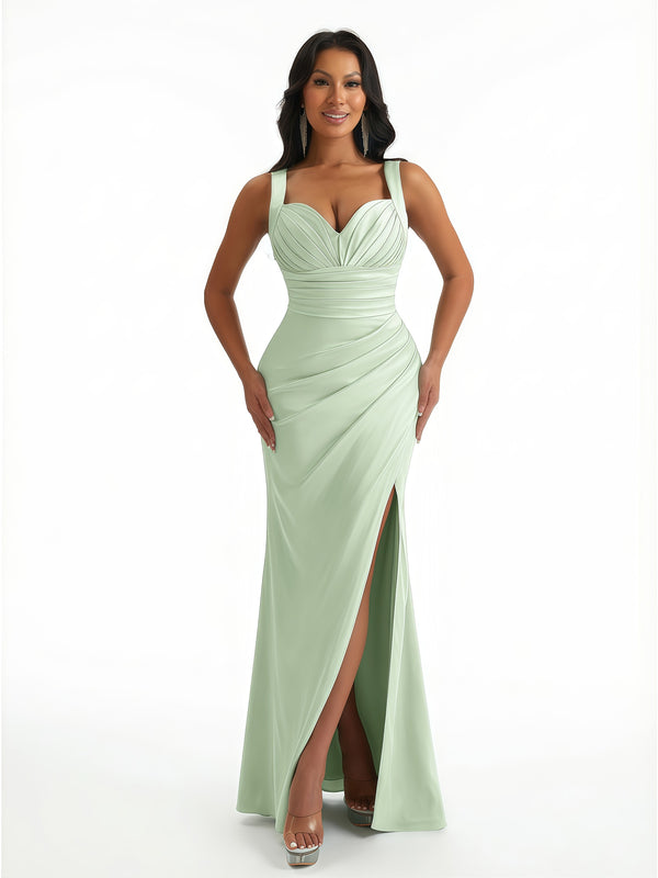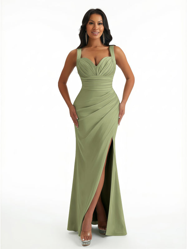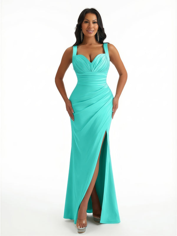 Sexy Spaghetti Straps Side Slit Mermaid Ruching Soft Satin Floor Length Evening Dresses - ChicSew – ChicSew
