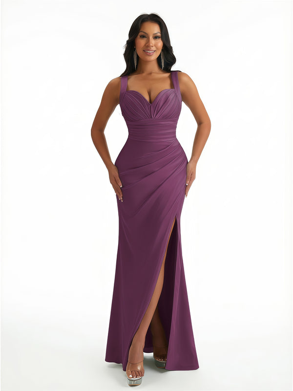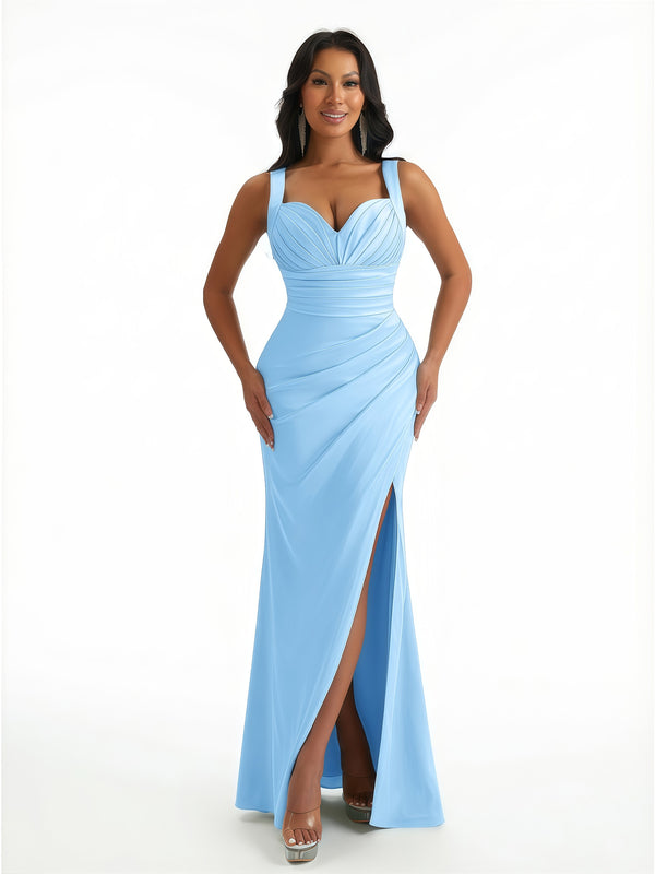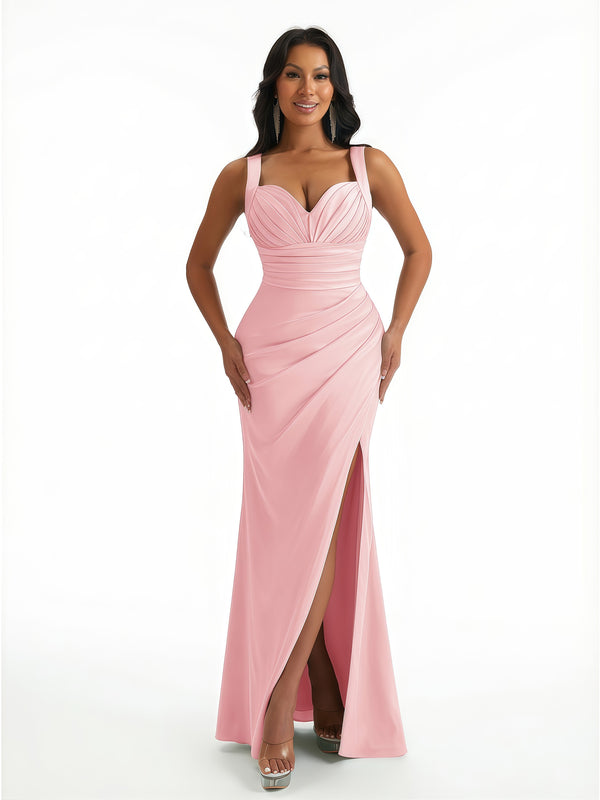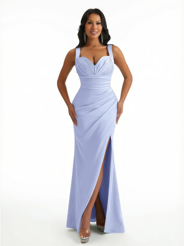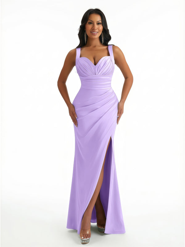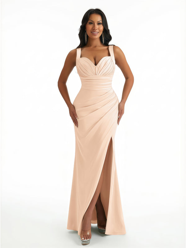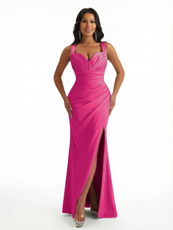 Sexy Spaghetti Straps Side Slit Mermaid Ruching Soft Satin Floor Length Evening Dresses - ChicSew – ChicSew