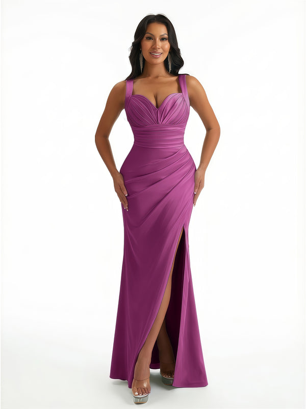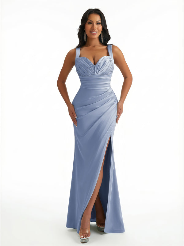 Elegant Womne's Mermaid Ruched Silky Satin Floor Length Evening Dresses Side Slit