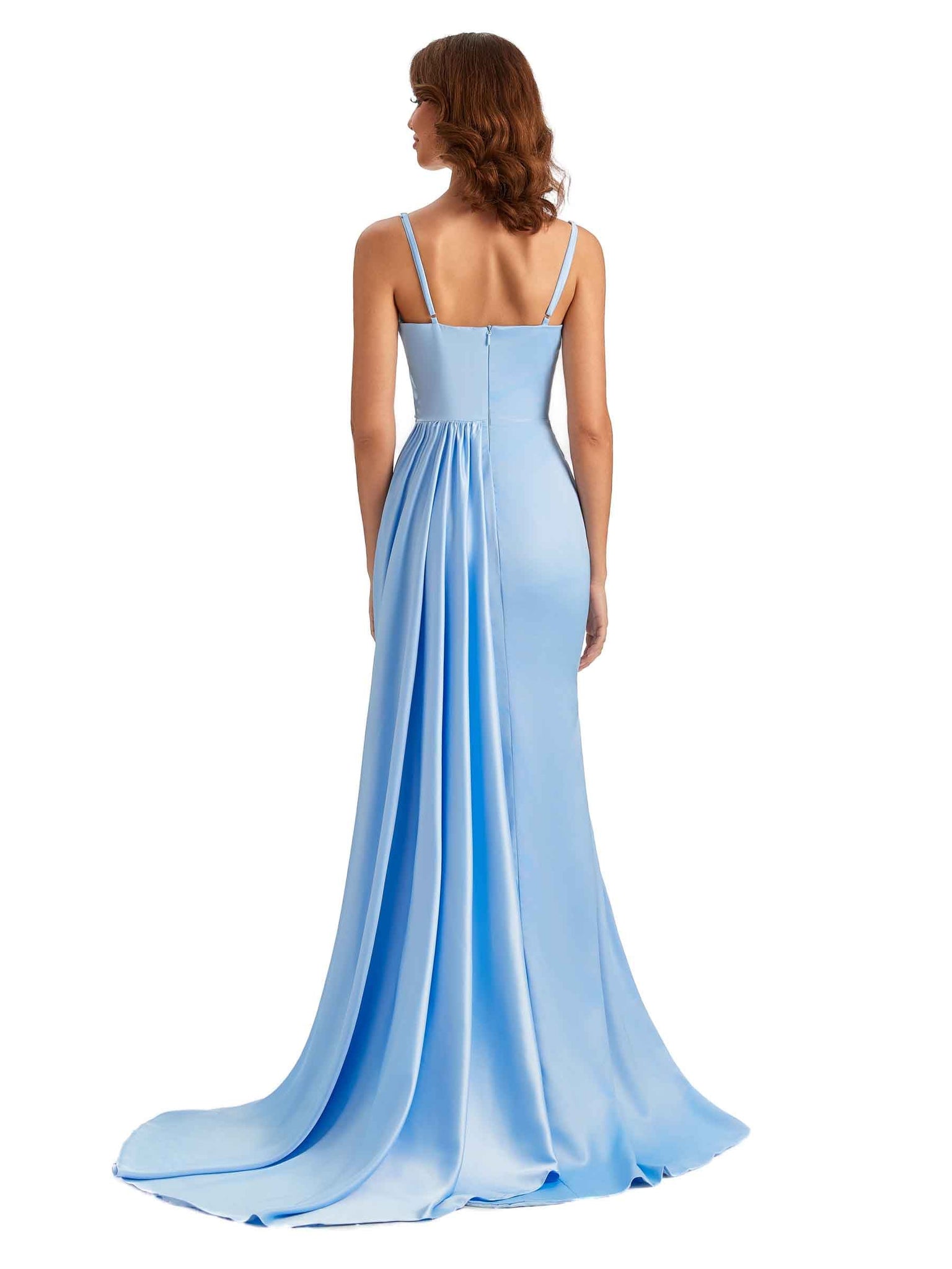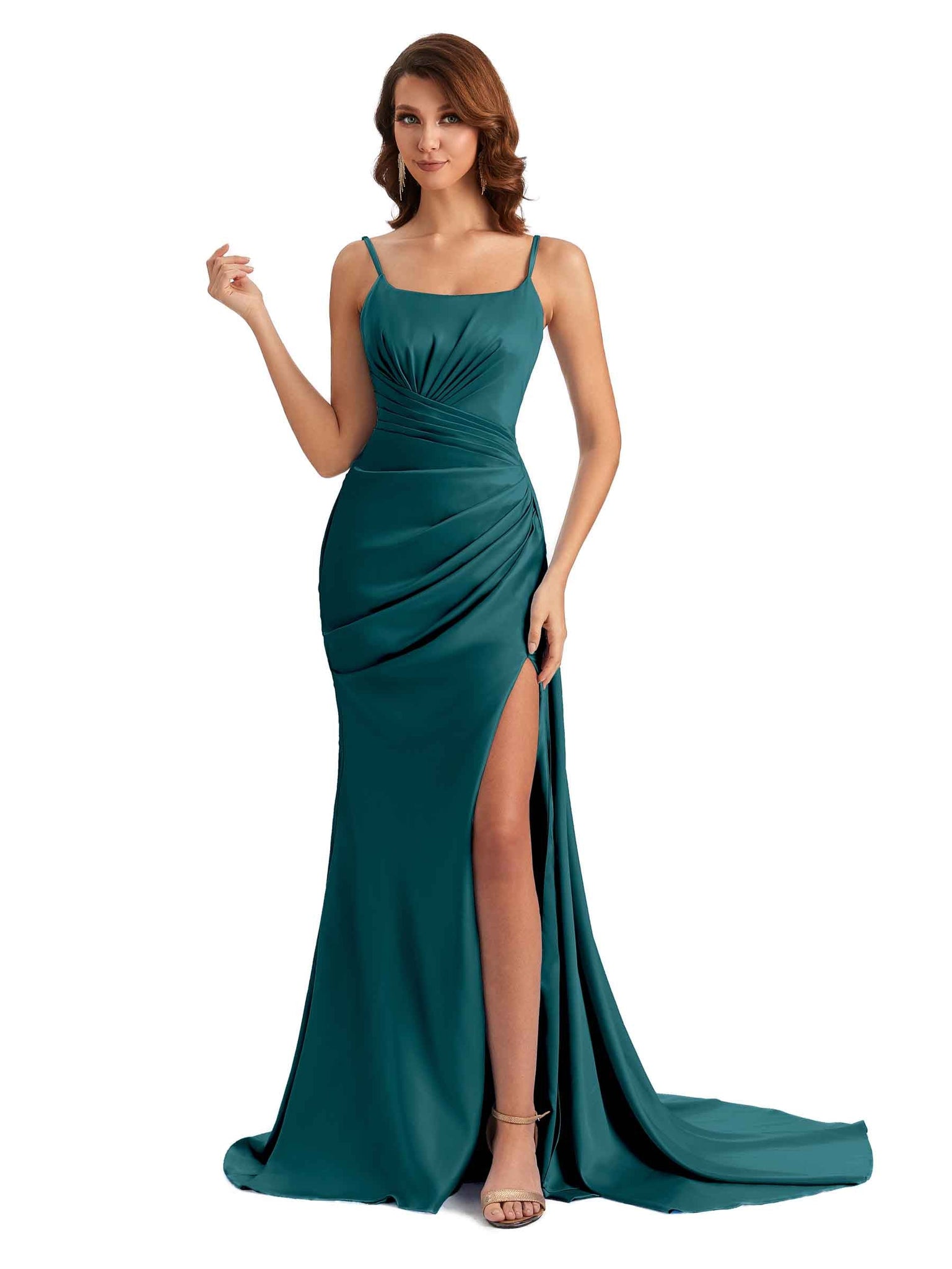 Sexy Mermaid Side Slit Silky Satin Unique Long Maxi Bridesmaid Dress For Wedding