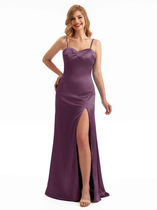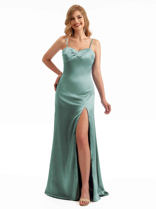 Simple Side Slit Boho Satin Spaghetti Straps Bridesmaid Dresses