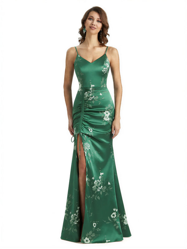 Simple Spaghetti Straps V-Neck Side Slit Mermaid Floral Satin Maxi Floral Formal Dresses For Women