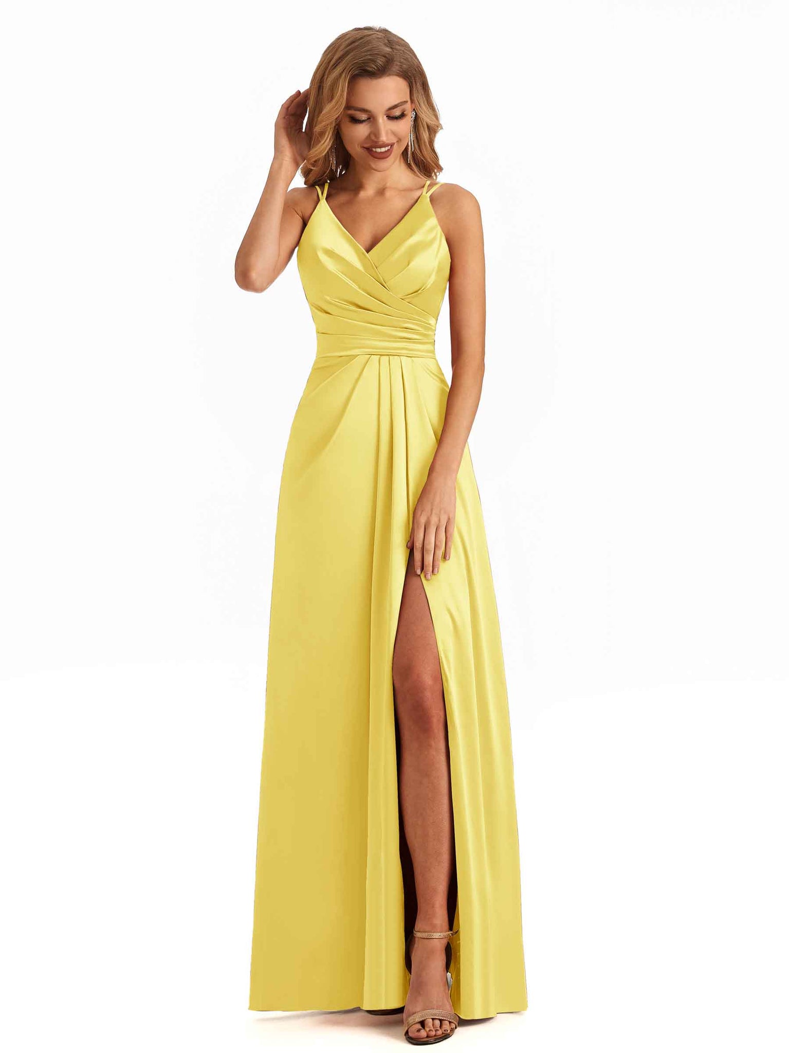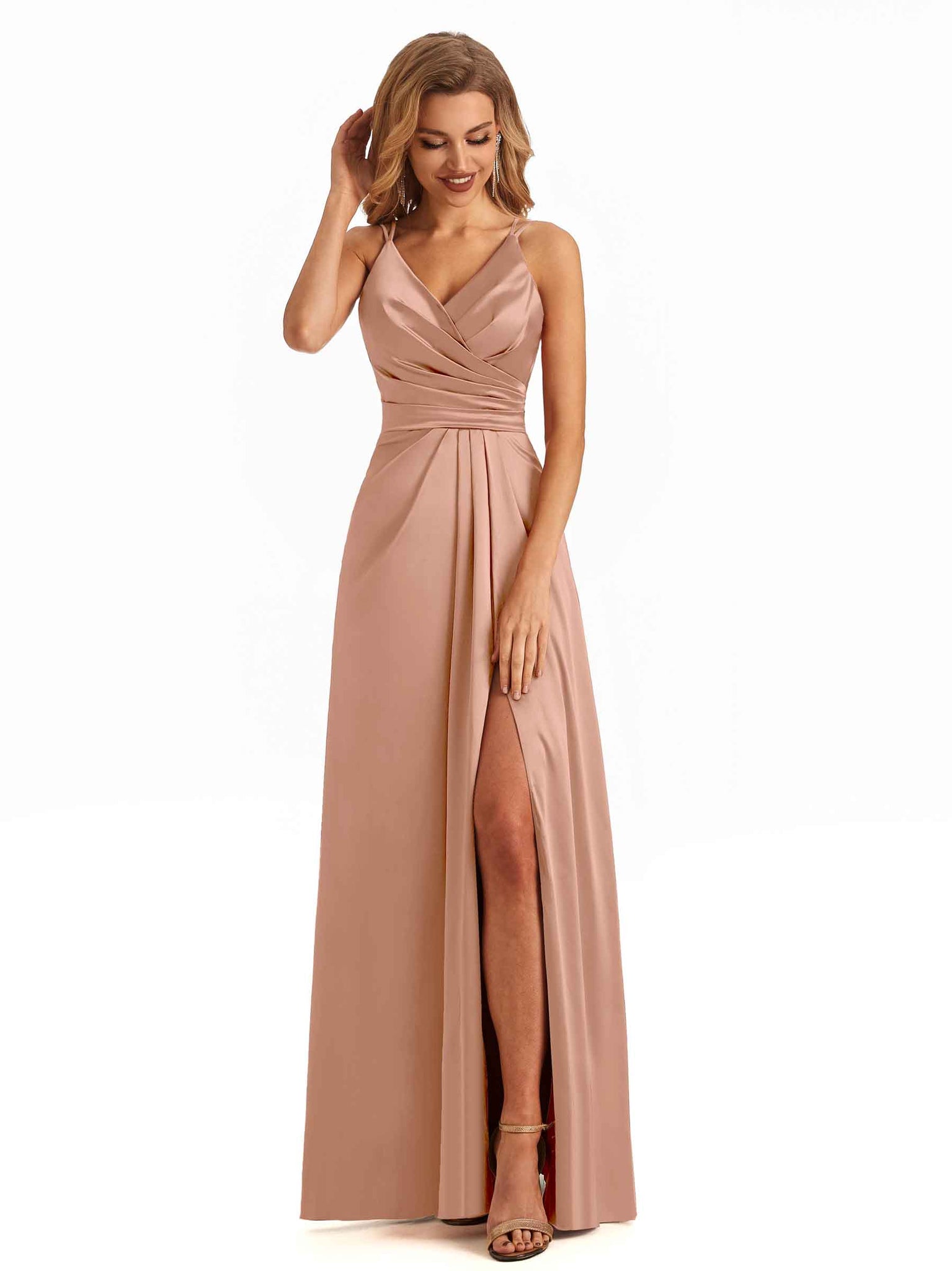 Soft Satin A-line Spaghetti Straps V neck Side Slit Maxi Long Bridesmaid Dresses - ChicSew – ChicSew