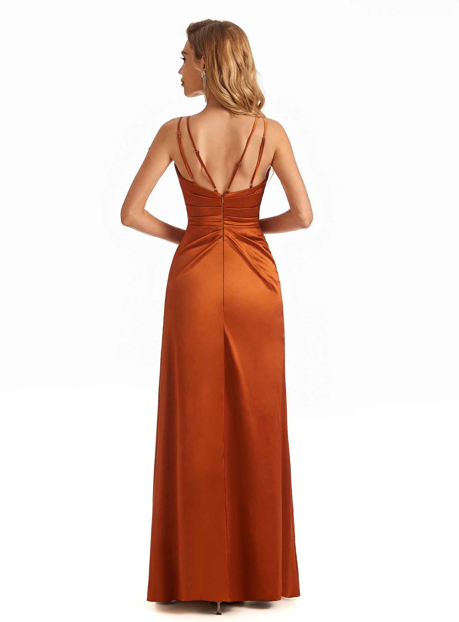 Soft Satin A-line Spaghetti Straps V neck Side Slit Maxi Long Bridesmaid Dresses