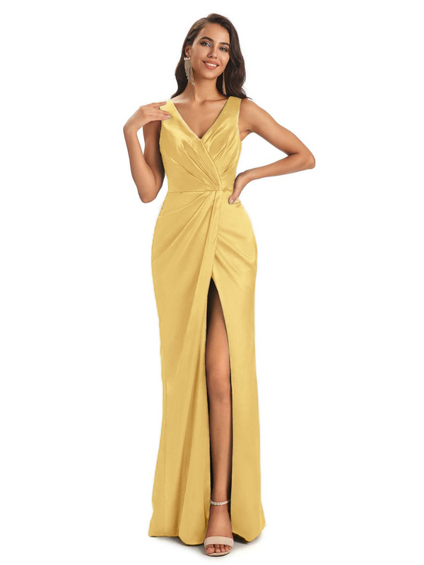 Soft Satin Front Slit V-neck Unique Long Bridesmaid Dresses Online