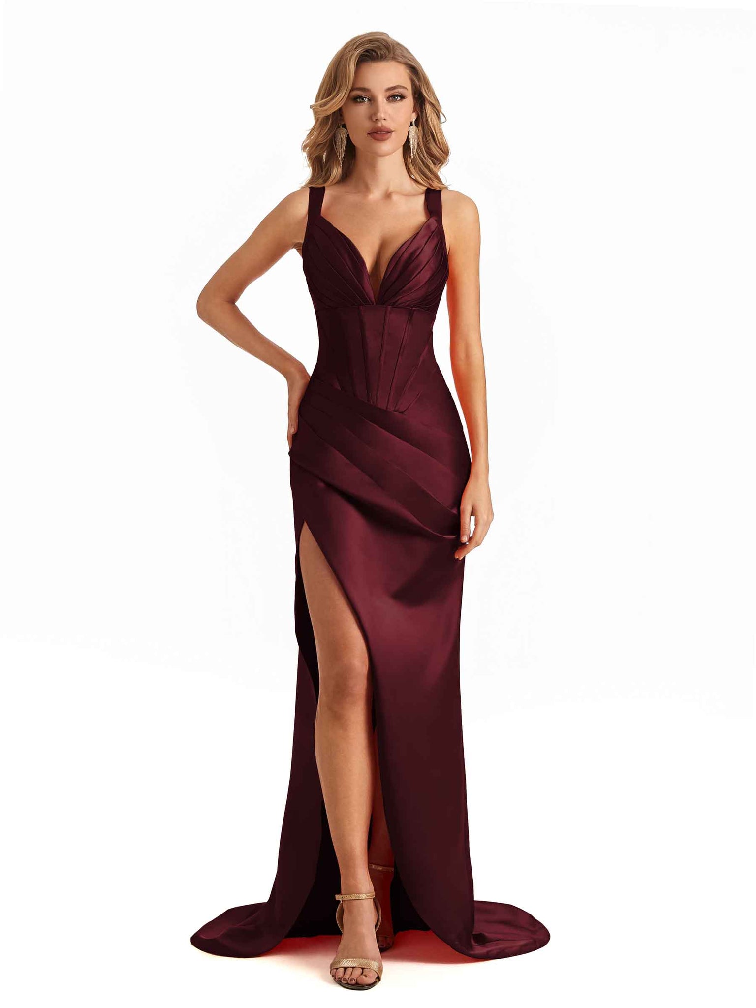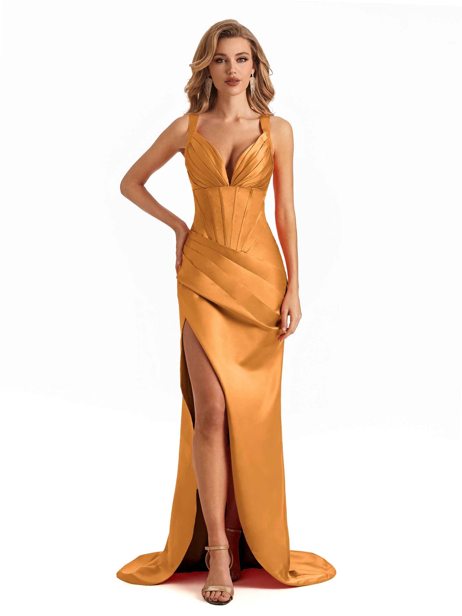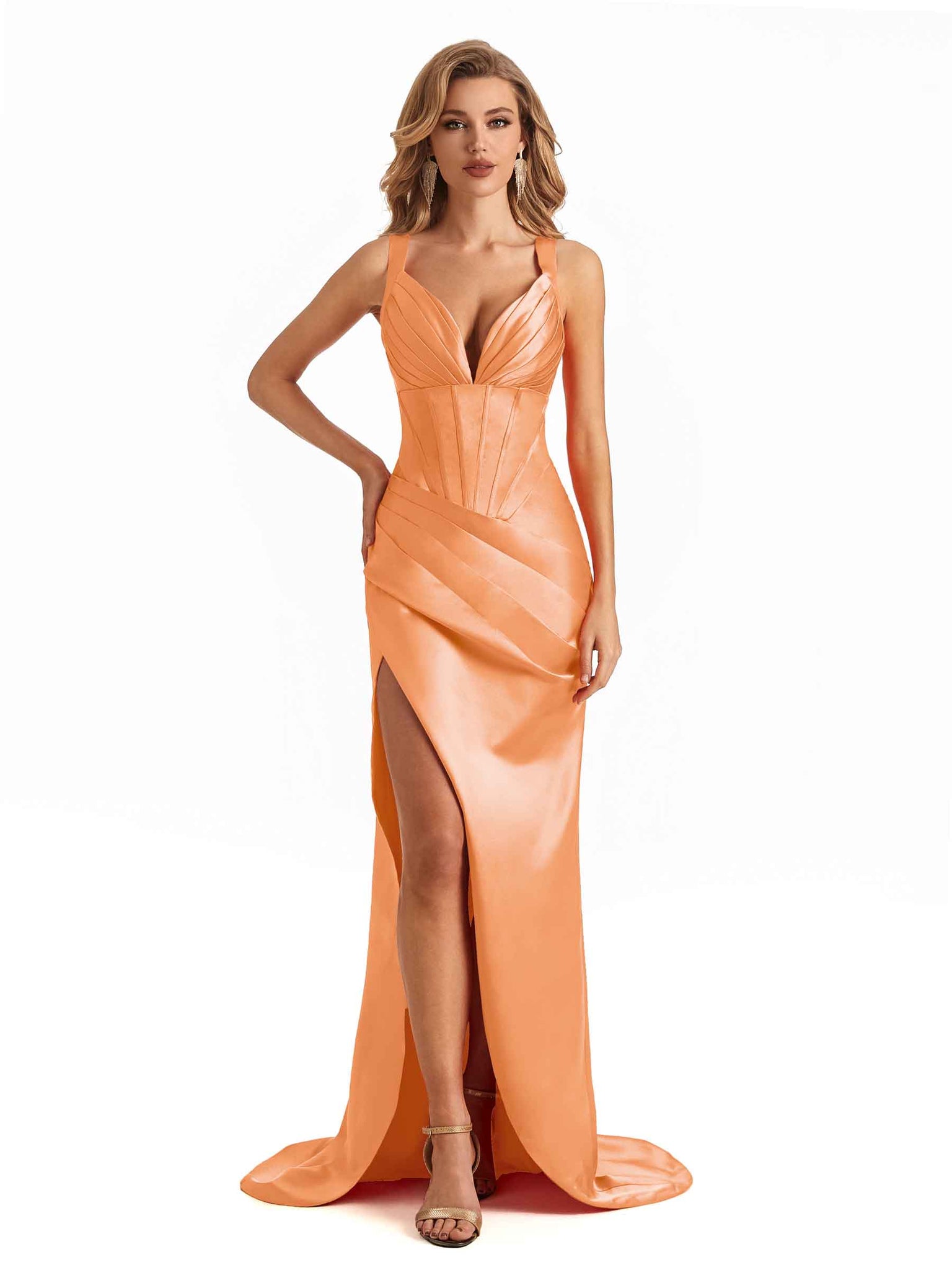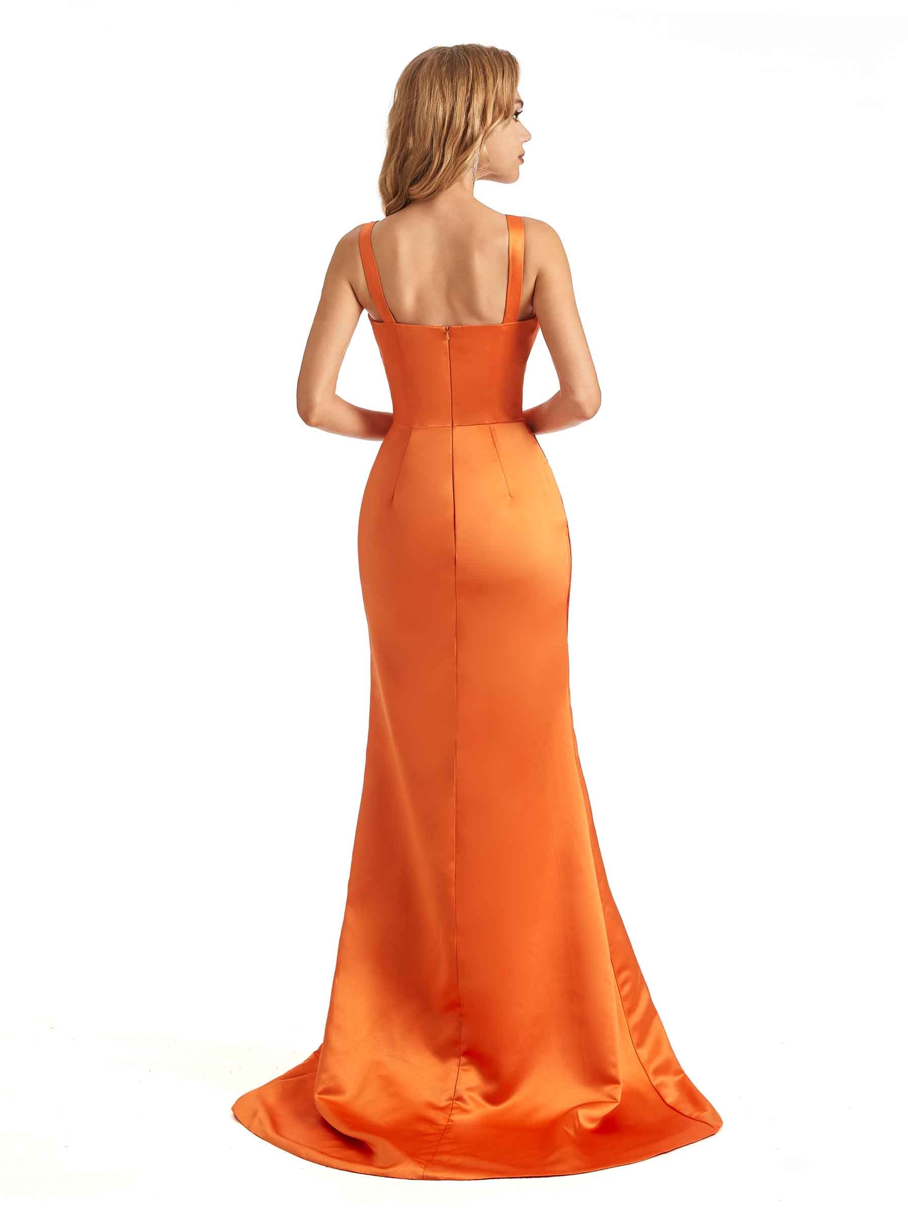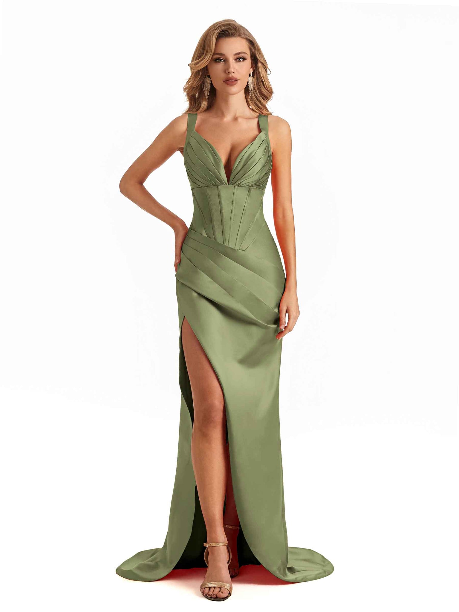 Soft Satin Unique Spaghetti Straps V-Neck Side Slit Mermaid Floor-Length Bridesmaid Dresses- ChicSew – ChicSew