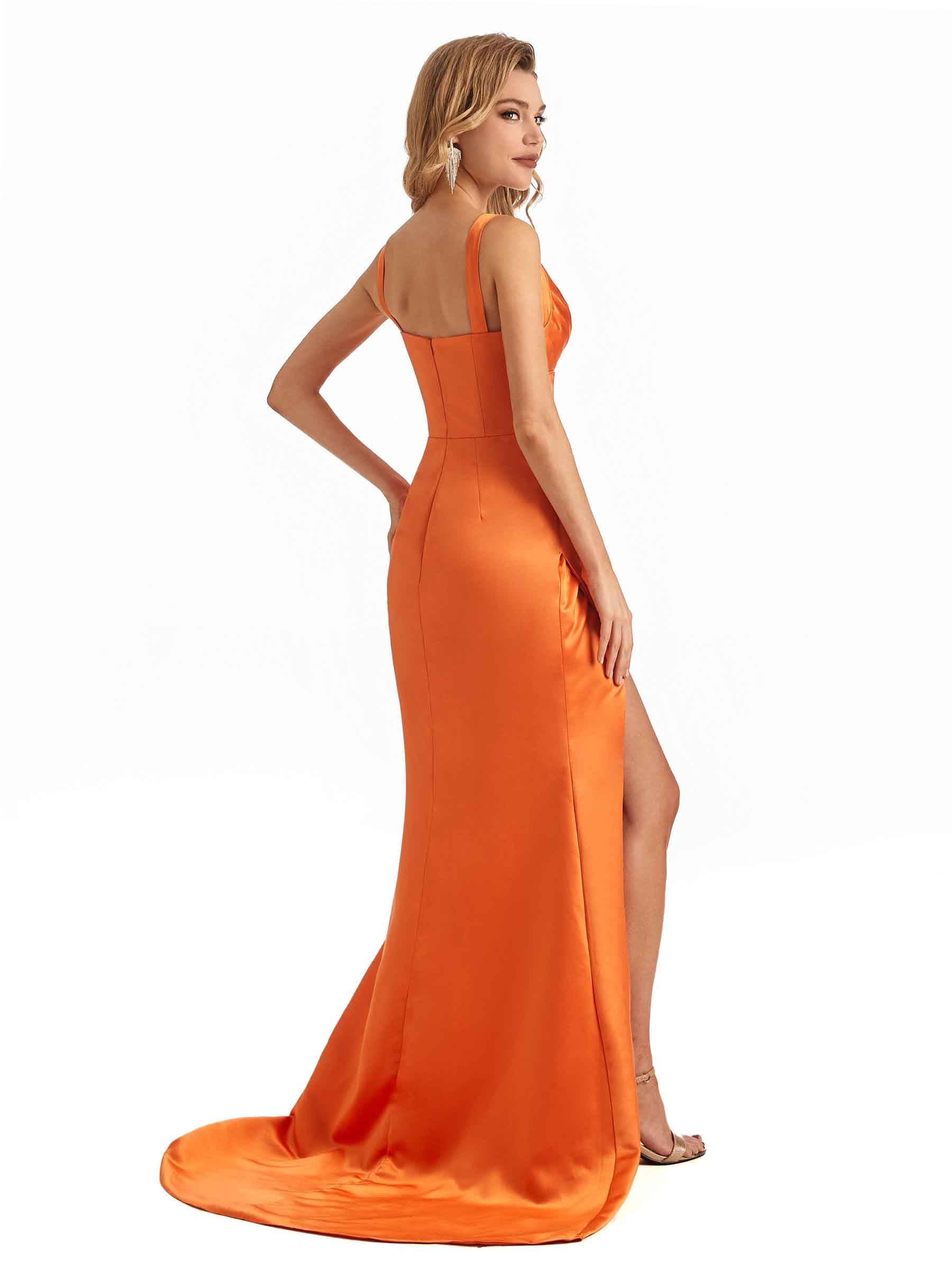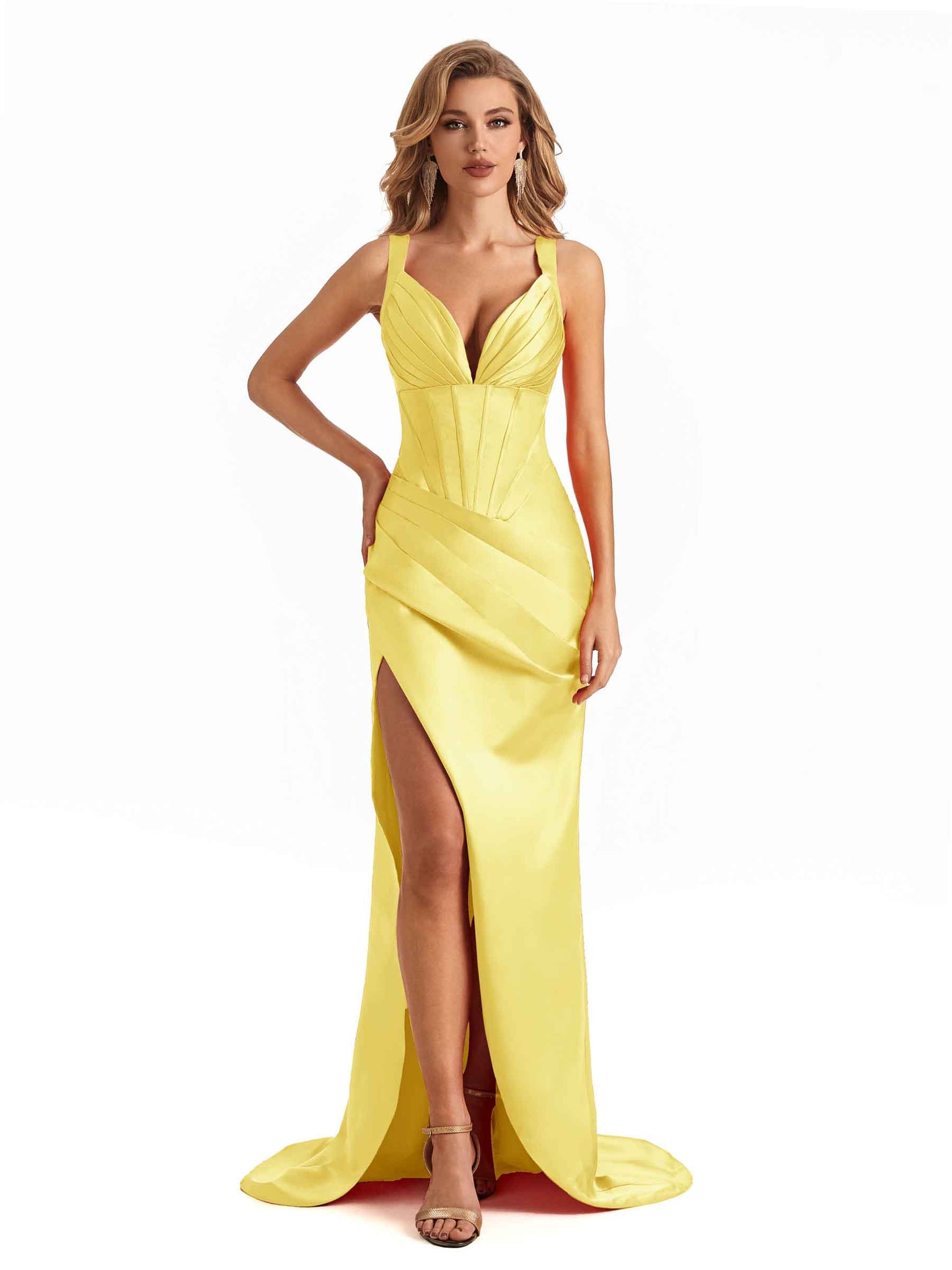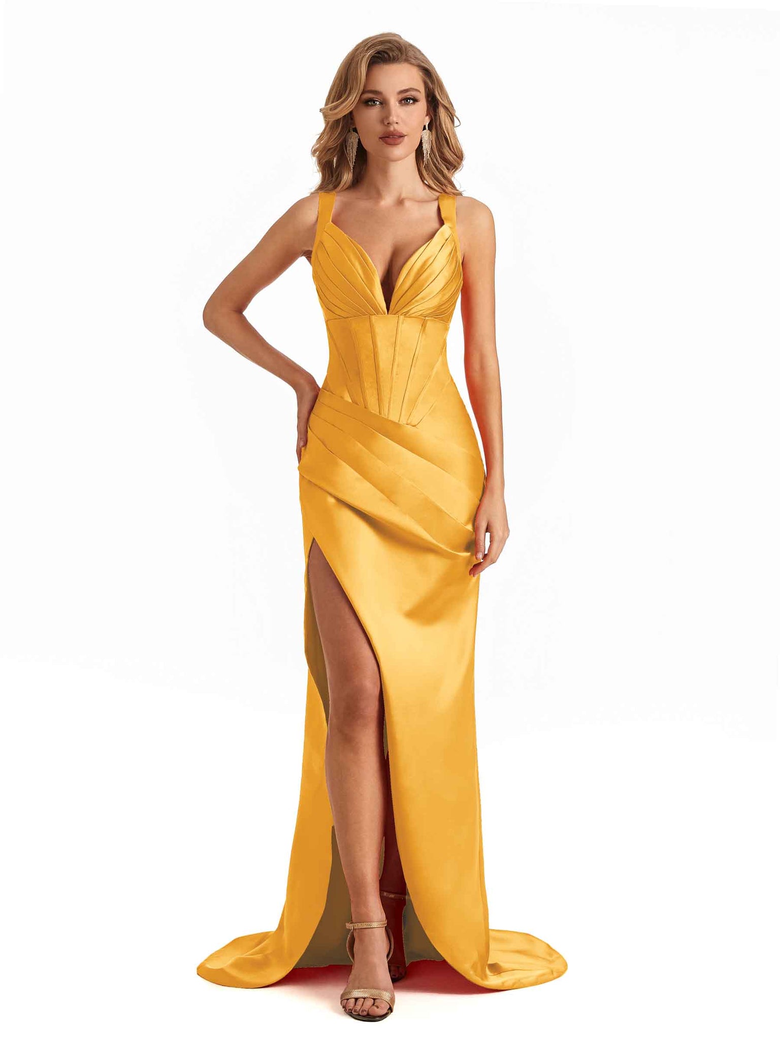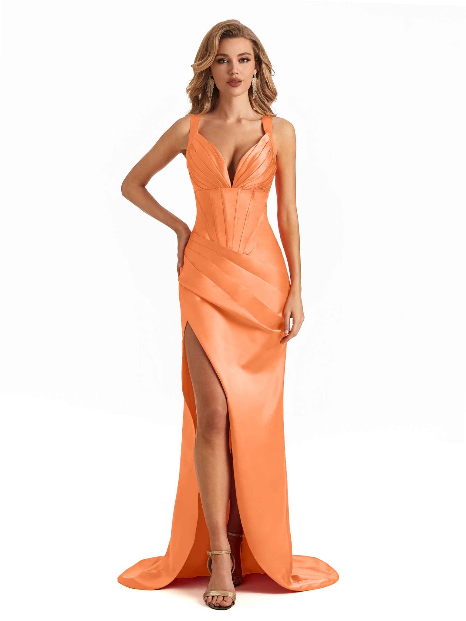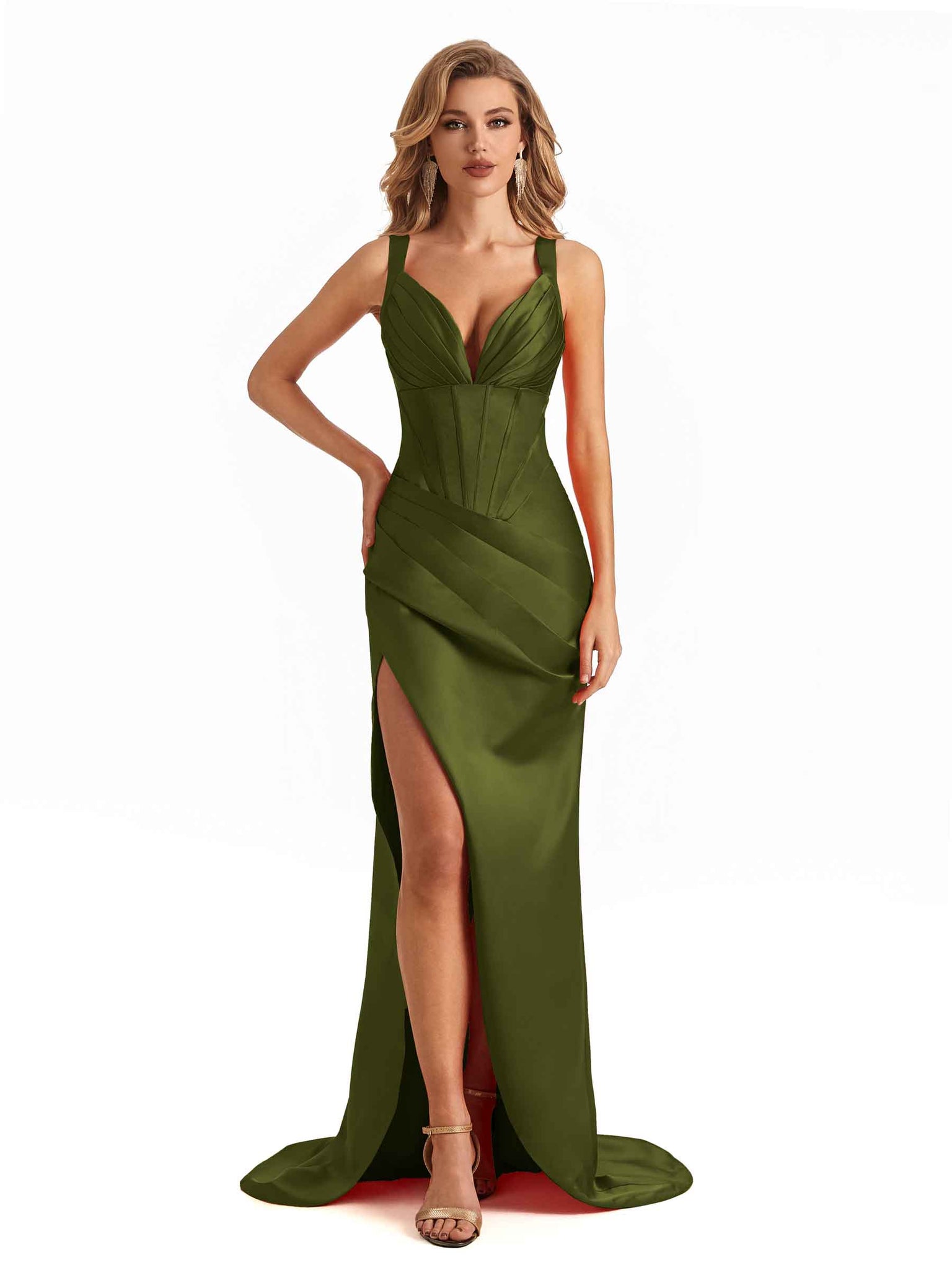 Soft Satin Unique Spaghetti Straps V-Neck Side Slit Mermaid Floor-Length Bridesmaid Dresses- ChicSew – ChicSew