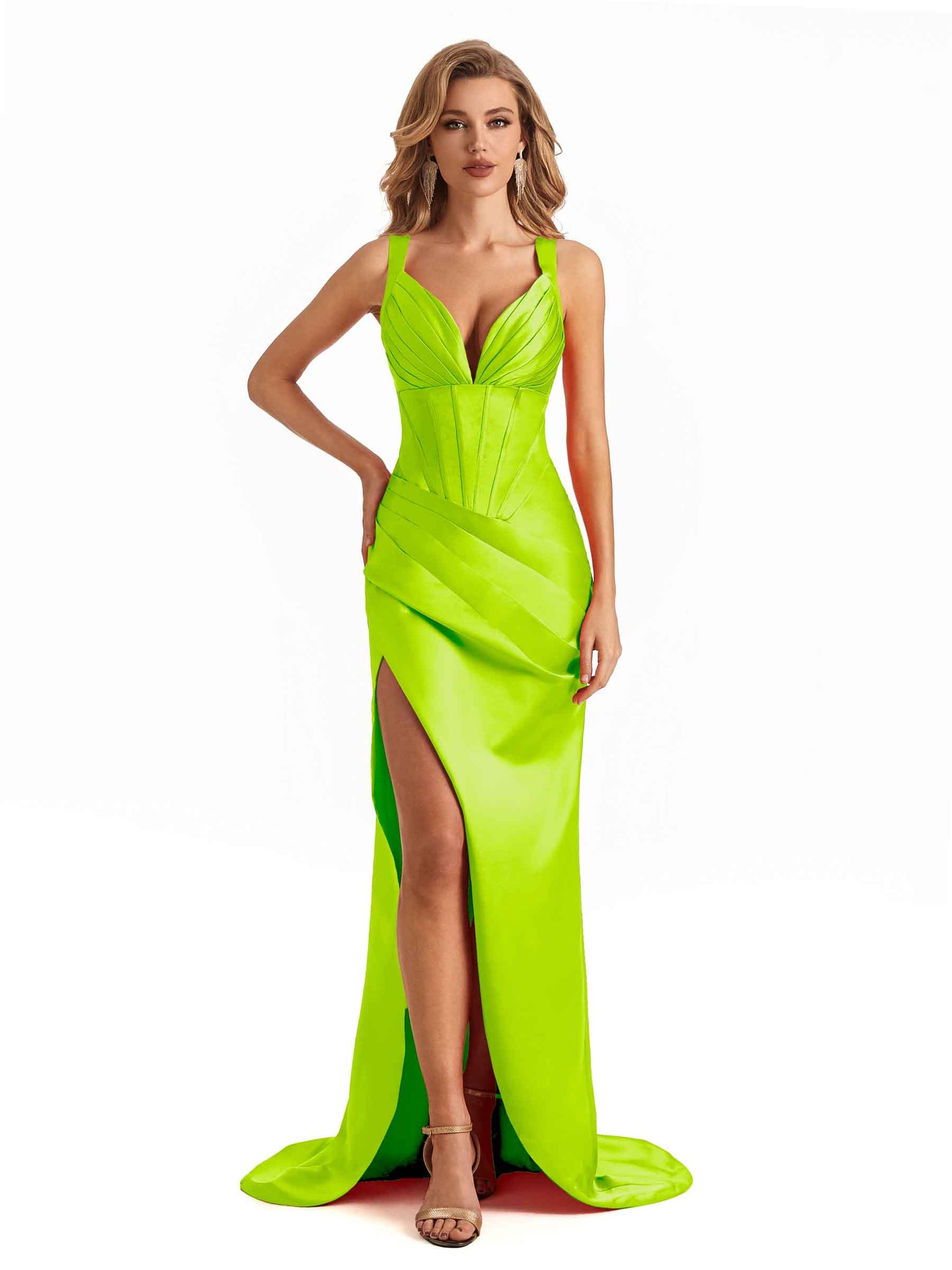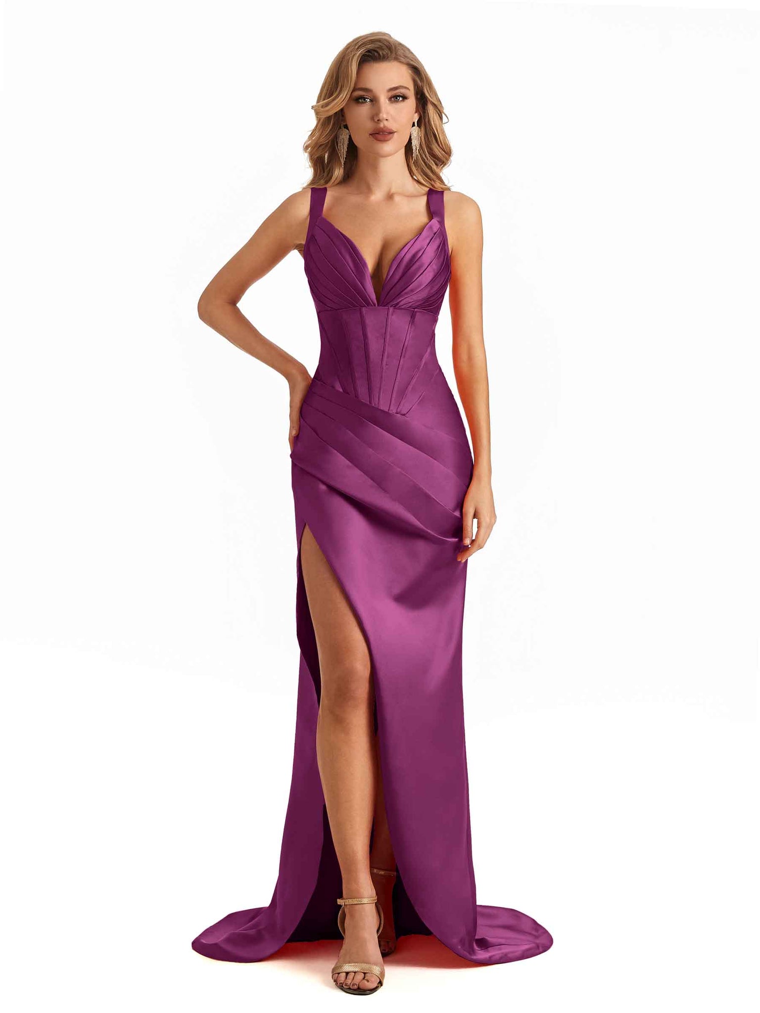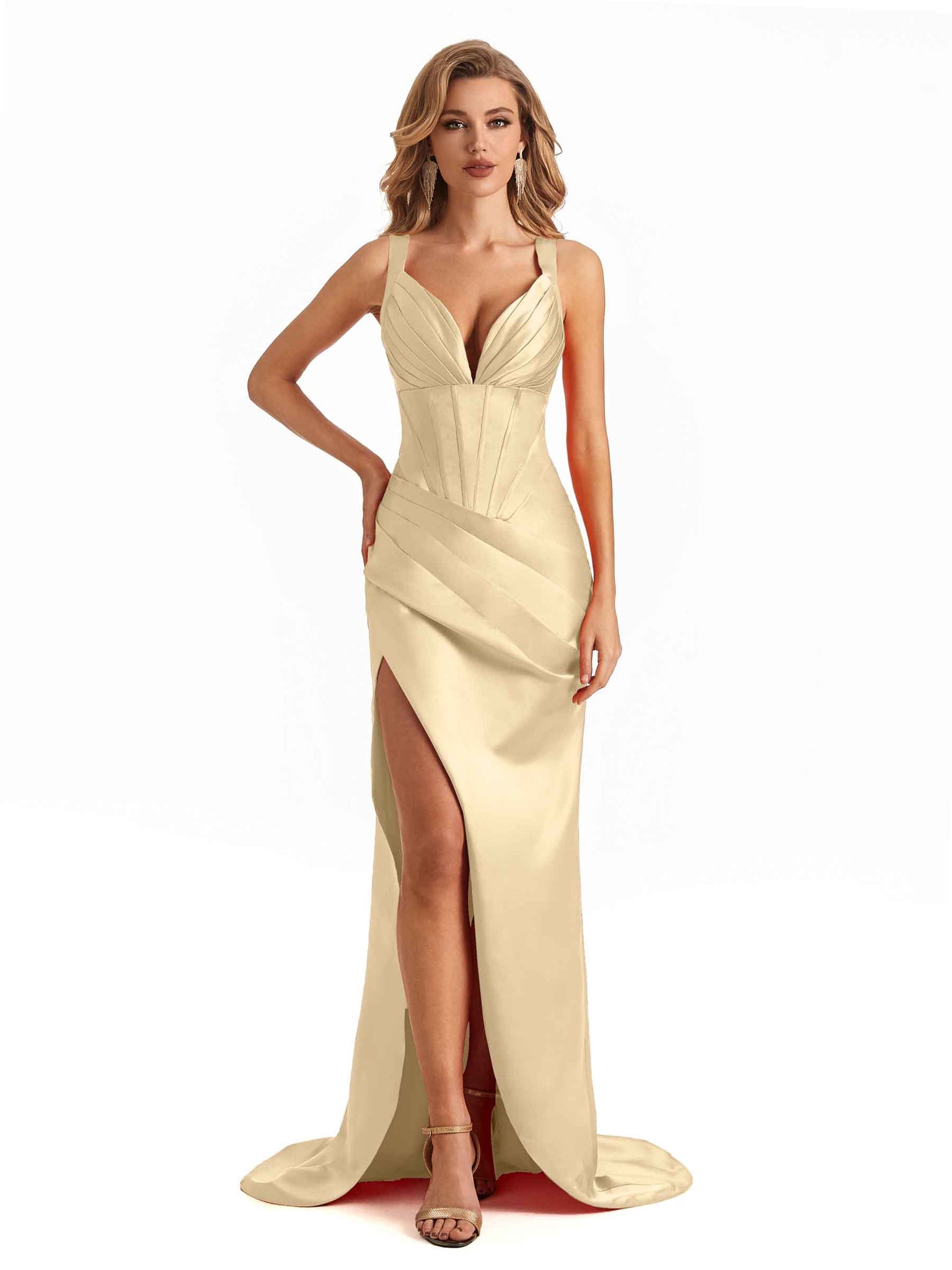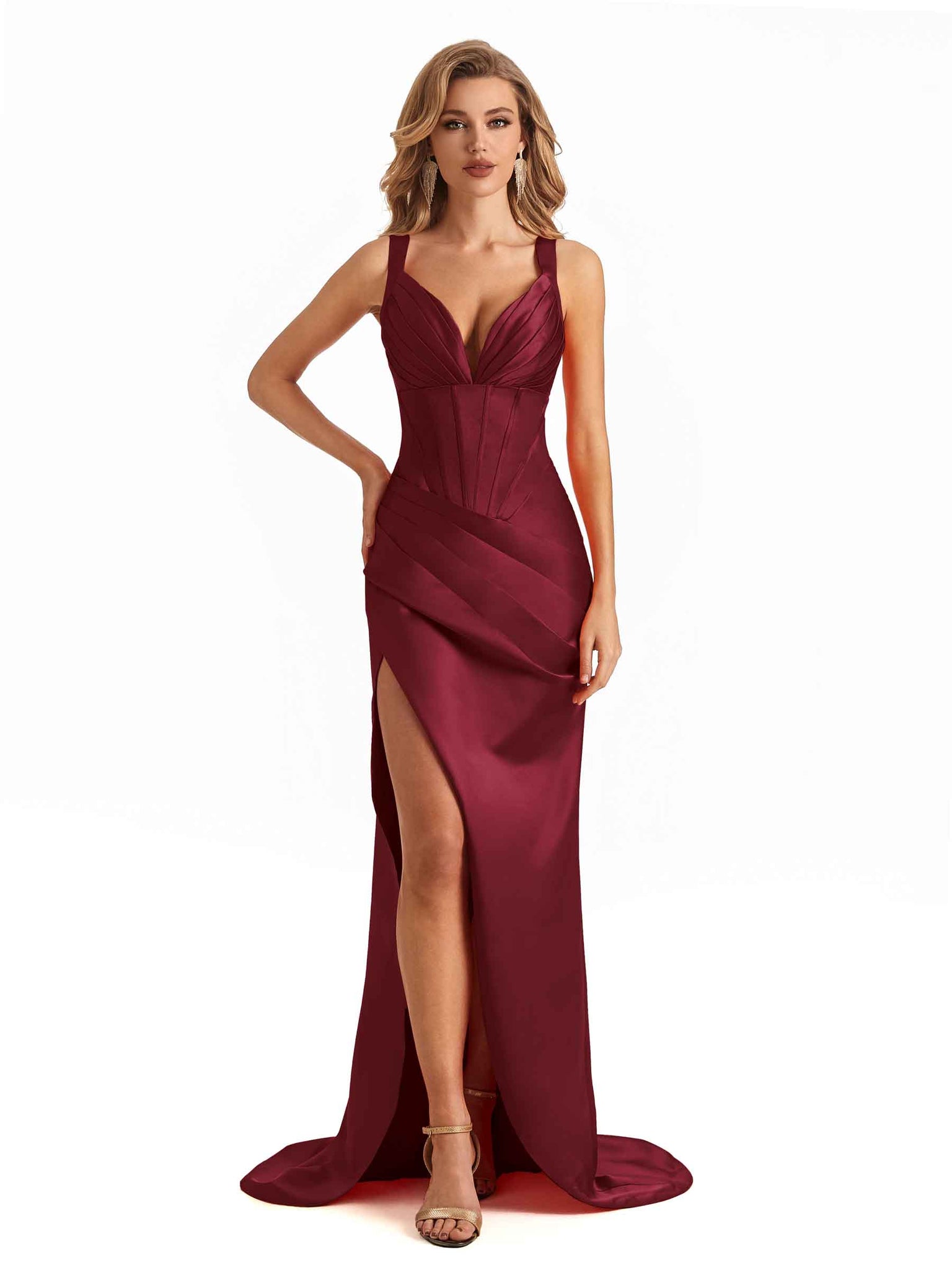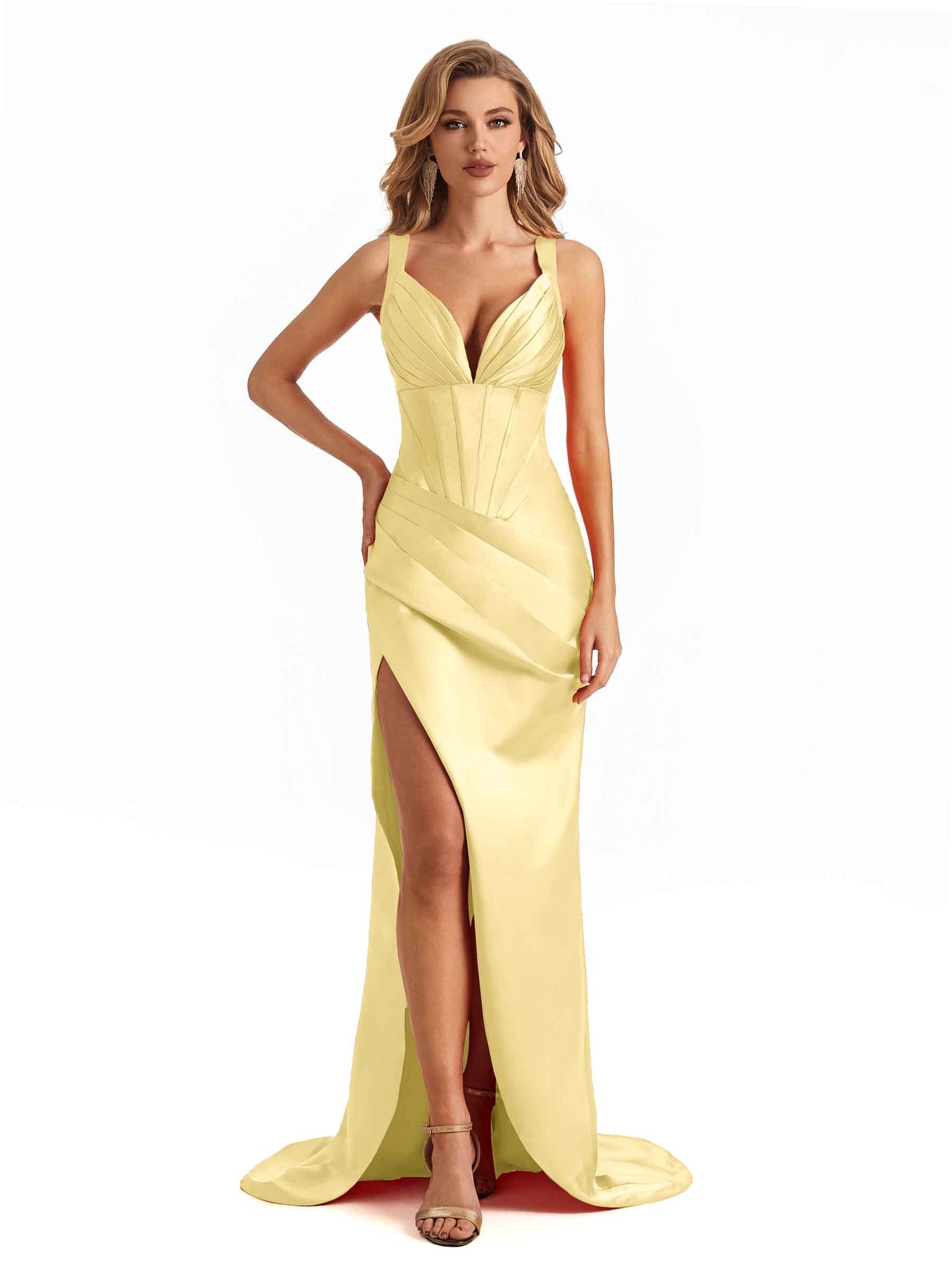 Soft Satin Unique Spaghetti Straps V-Neck Side Slit Mermaid Floor-Length Bridesmaid Dresses- ChicSew – ChicSew