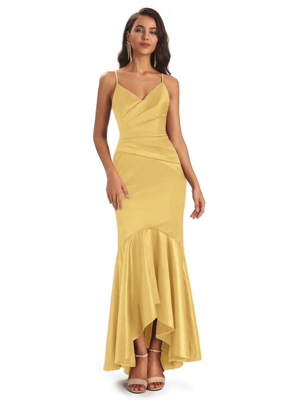 Spaghetti Straps V-Neck Soft Satin Asymmetrical High Low Bridesmaid Dresses Online