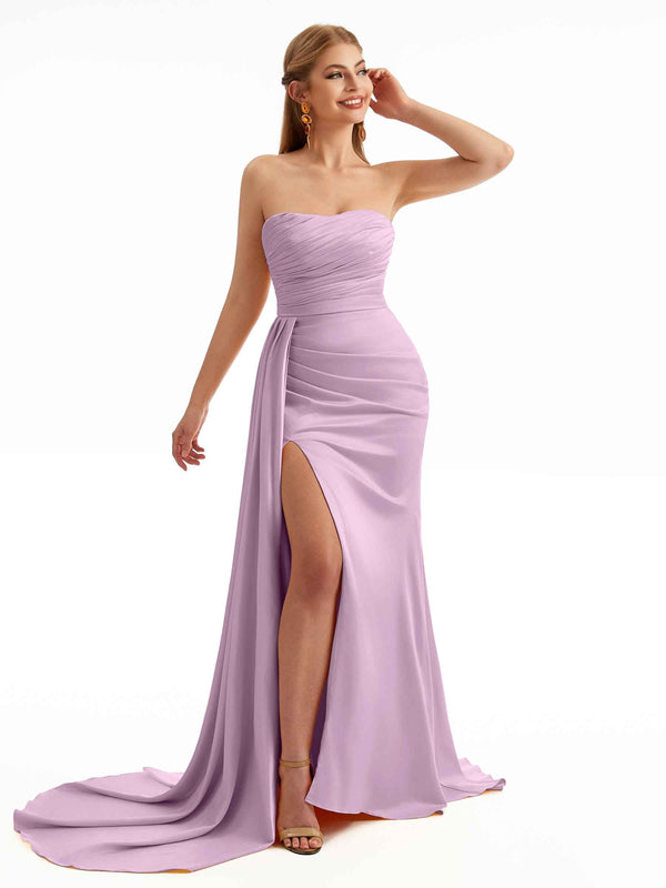 Strapless Side Sash Overlay Boho Bridesmaid Dresses Stretch Satin