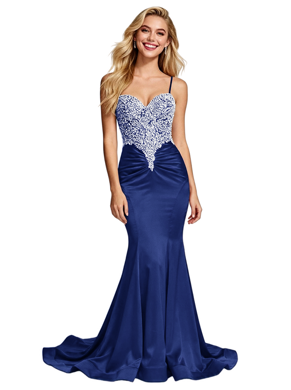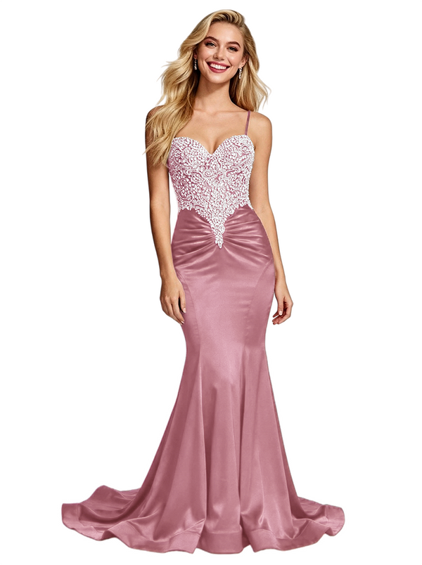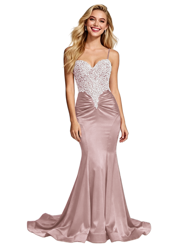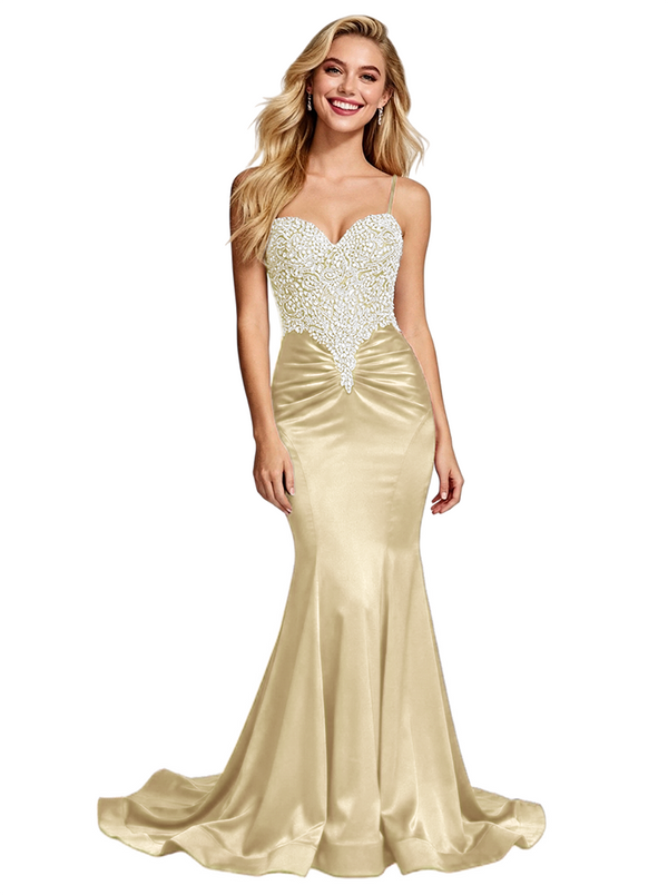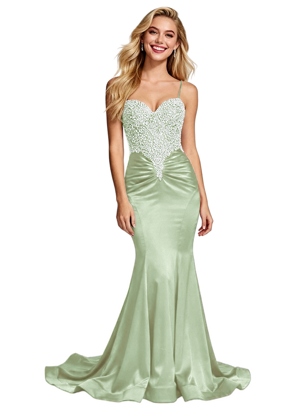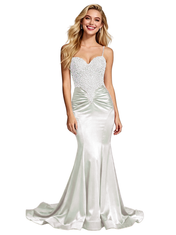 Stunning Beaded Satin Prom Gown Unique Mermaid Long Dress Spaghetti Straps