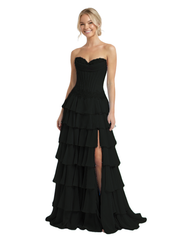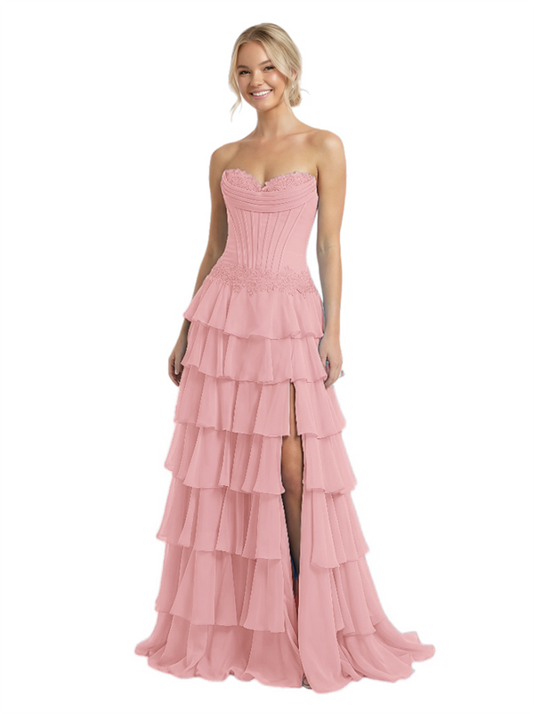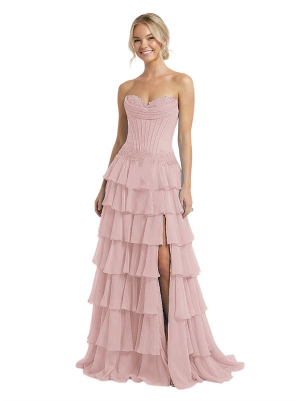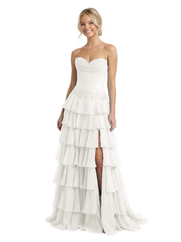 Stunning Sweetheart Tiered Ruffles Lace Appliques A-Line Chiffon Strapless Prom Dress - ChicSew – ChicSew