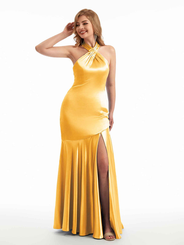 Summer Sexy Halter Ruffles Satin Long Bridesmaid Dresses