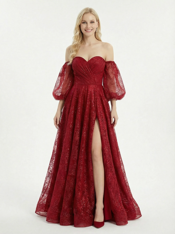 Elegant Off Shoulder Sequin Sweetheart Long Prom Dresses With Sleeve