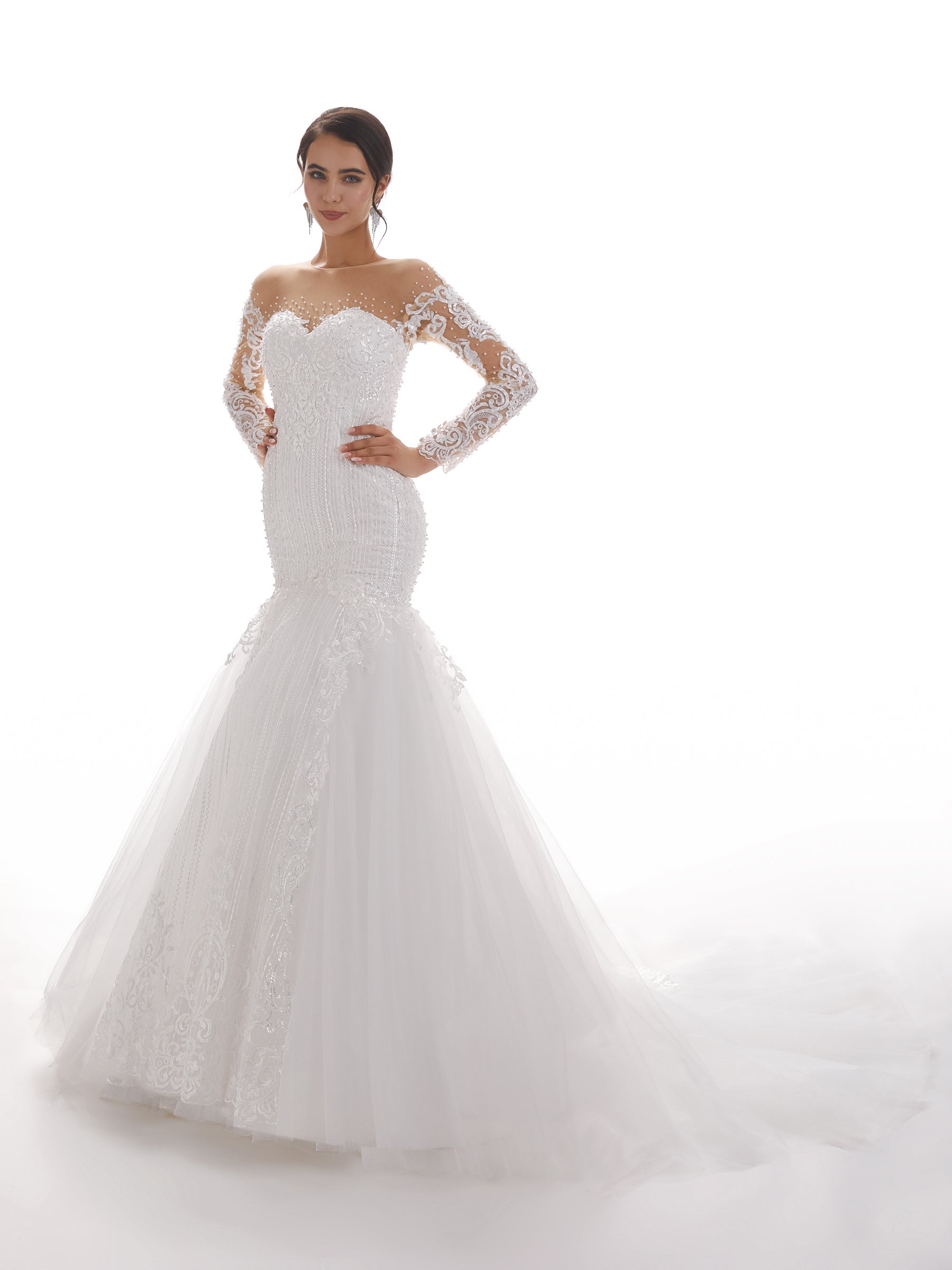 Sweetheart Long Sleeves Long Mermaid Ivory Lace Chapel Train Wedding Dresses