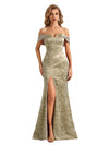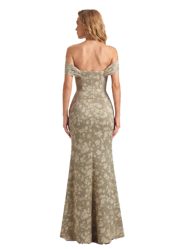 Trendy Off Shoulder Side Slit Mermaid Long Satin Floral Formal Evening Dresses For Ladies