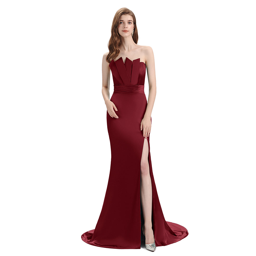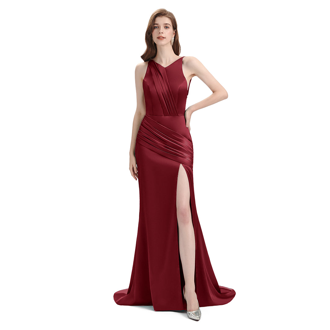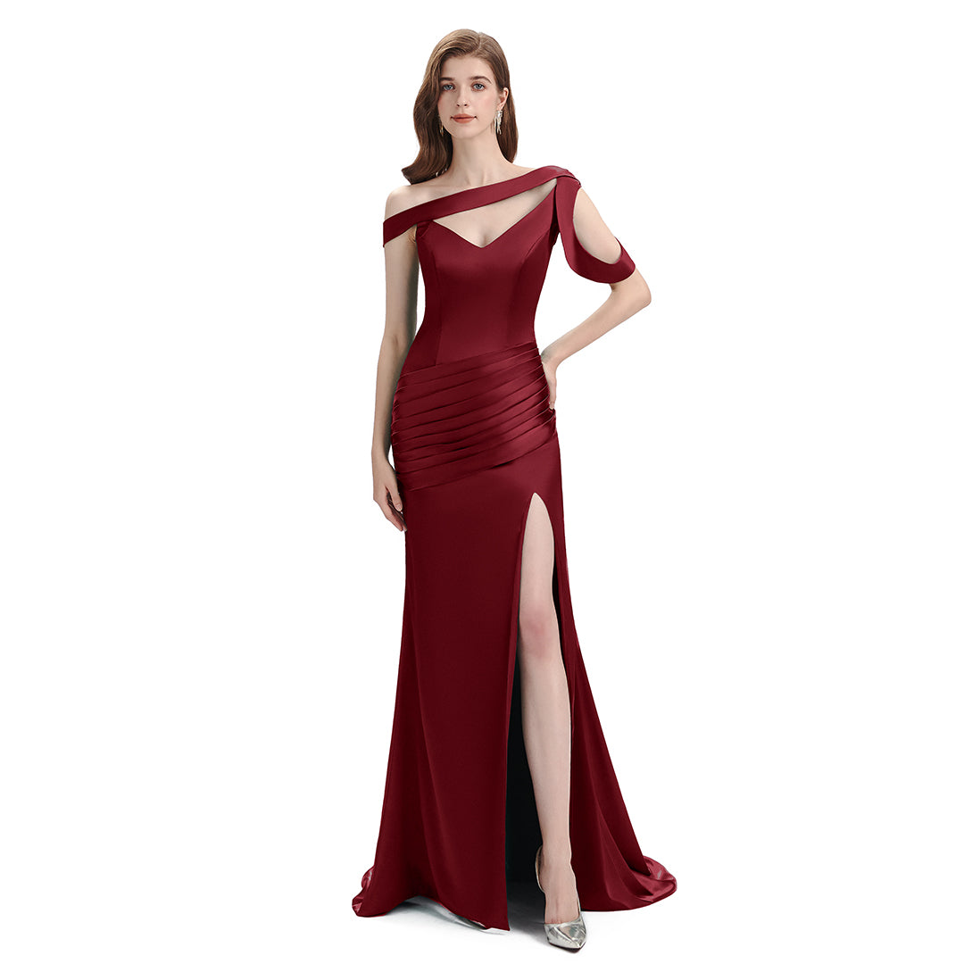 Unique Mismatched Side Slit Soft Satin Cheap Mermaid Burgundy Maid Of Honor Dresses