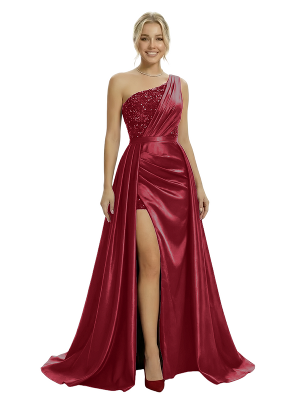 Unique One Shoulder Sequin Side Slit Satin Mermaid Prom Dress With Detachable Skirt - ChicSew – ChicSew