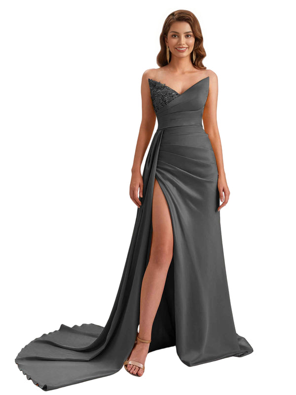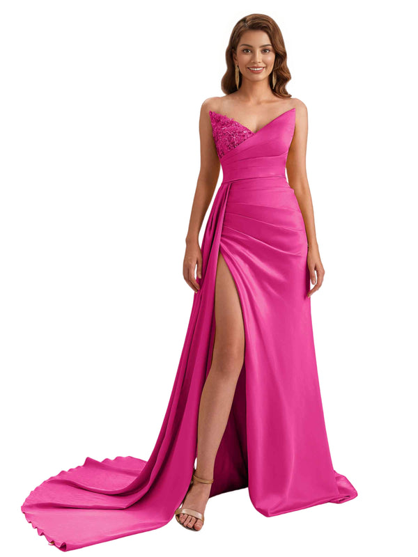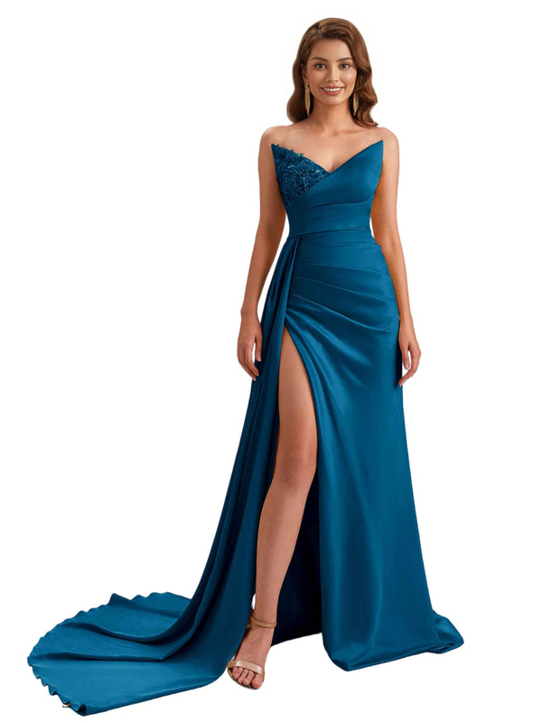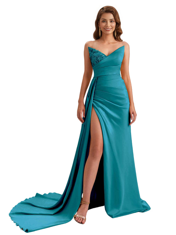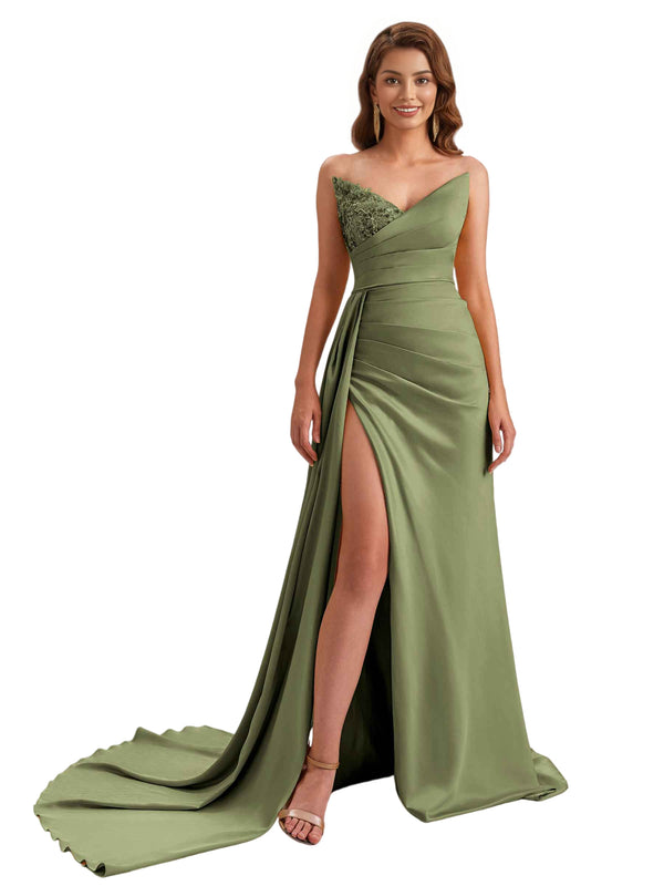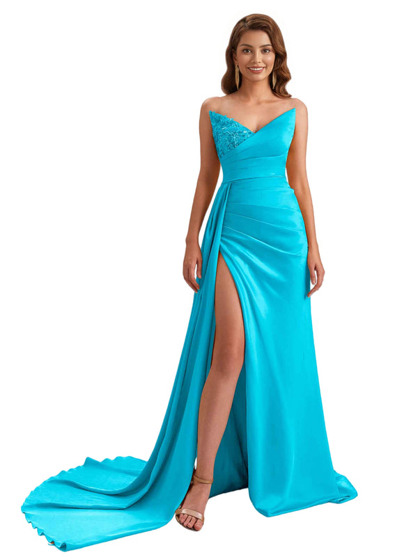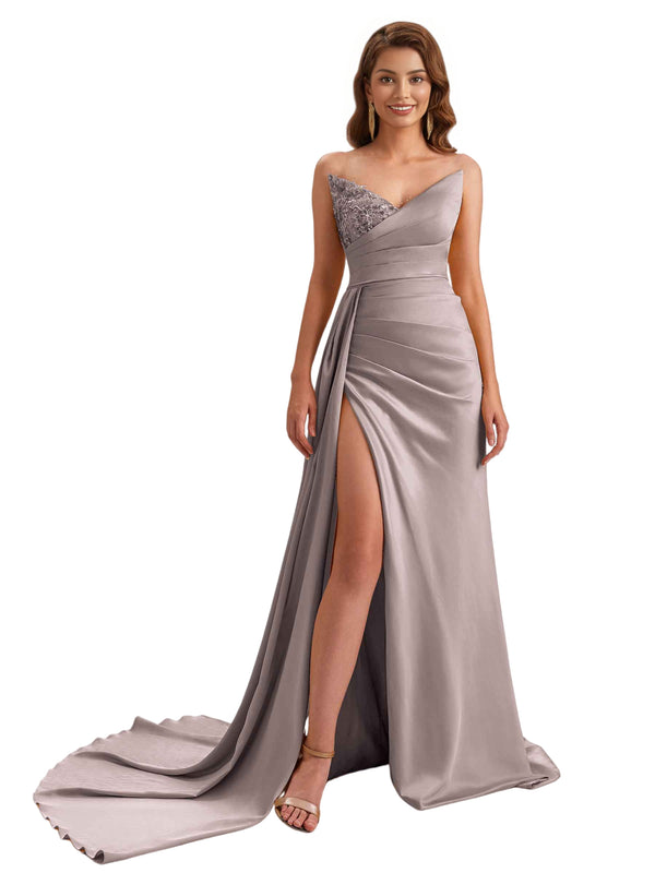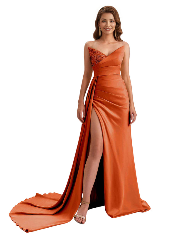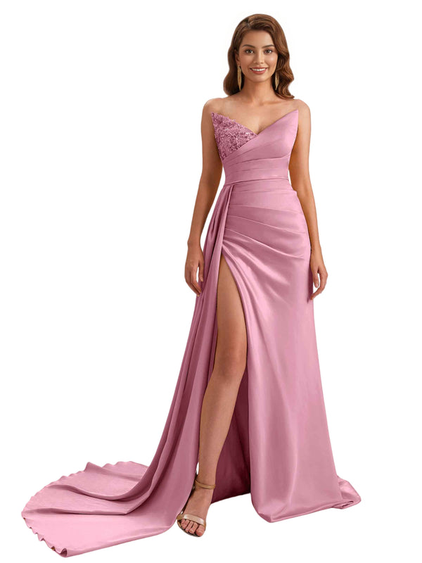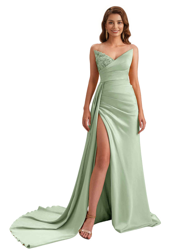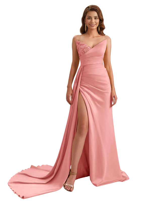 Unique Soft Satin Mermaid Sweetheart V-Neck Side Slit Long Bridesmaid Dresses Online - ChicSew – ChicSew
