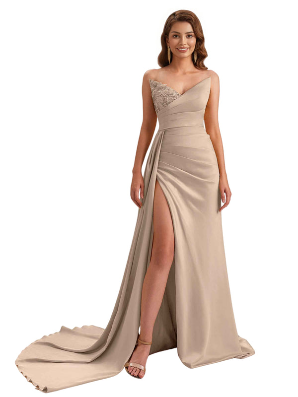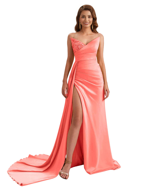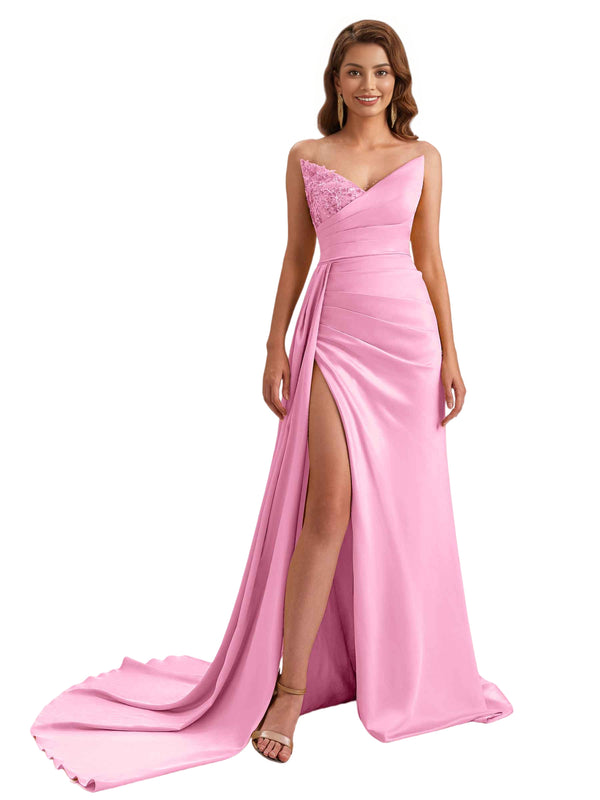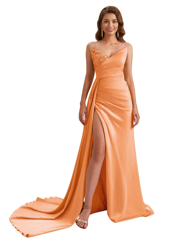 Unique Soft Satin Mermaid Sweetheart V-Neck Side Slit Long Bridesmaid Dresses Online