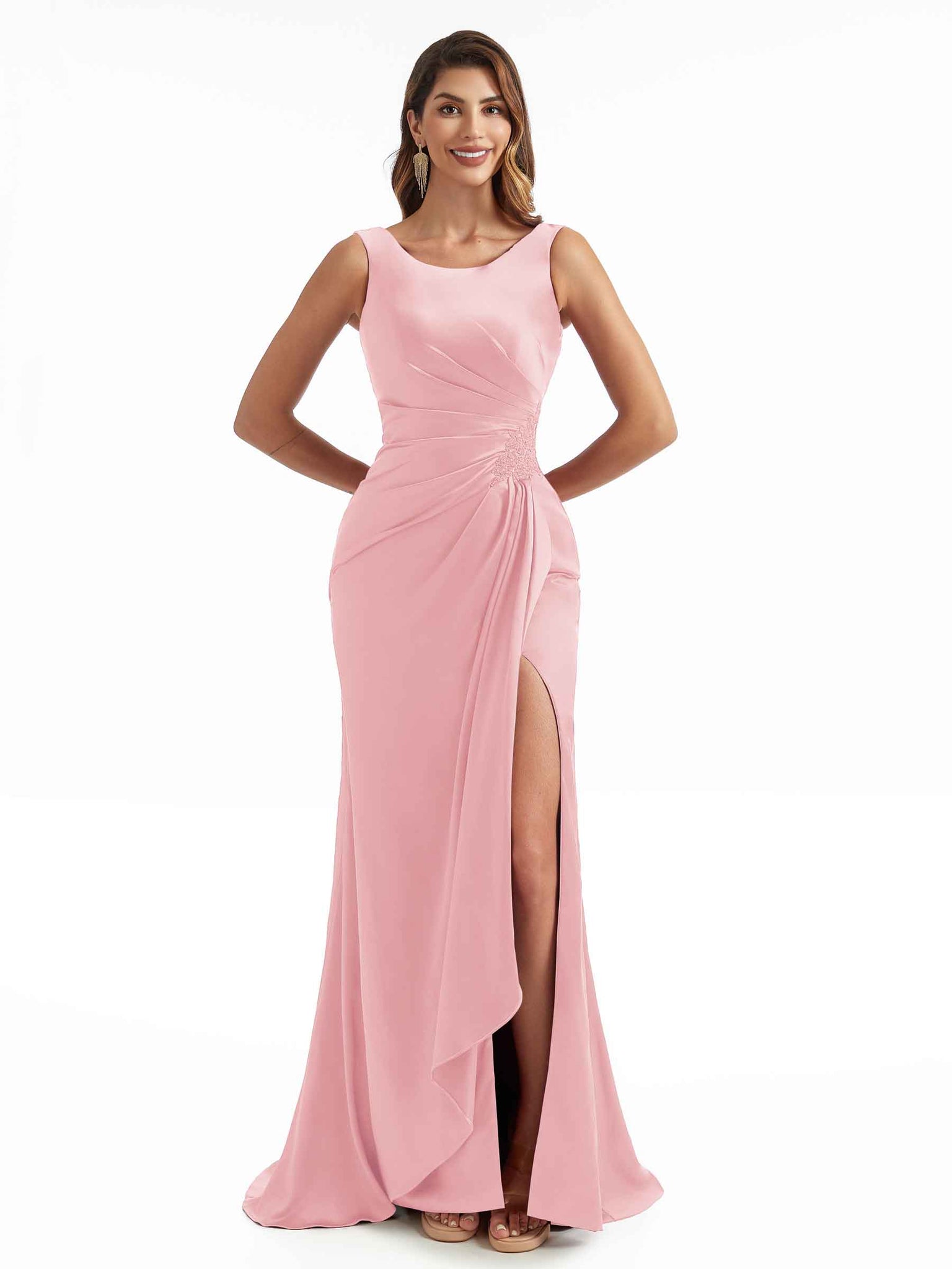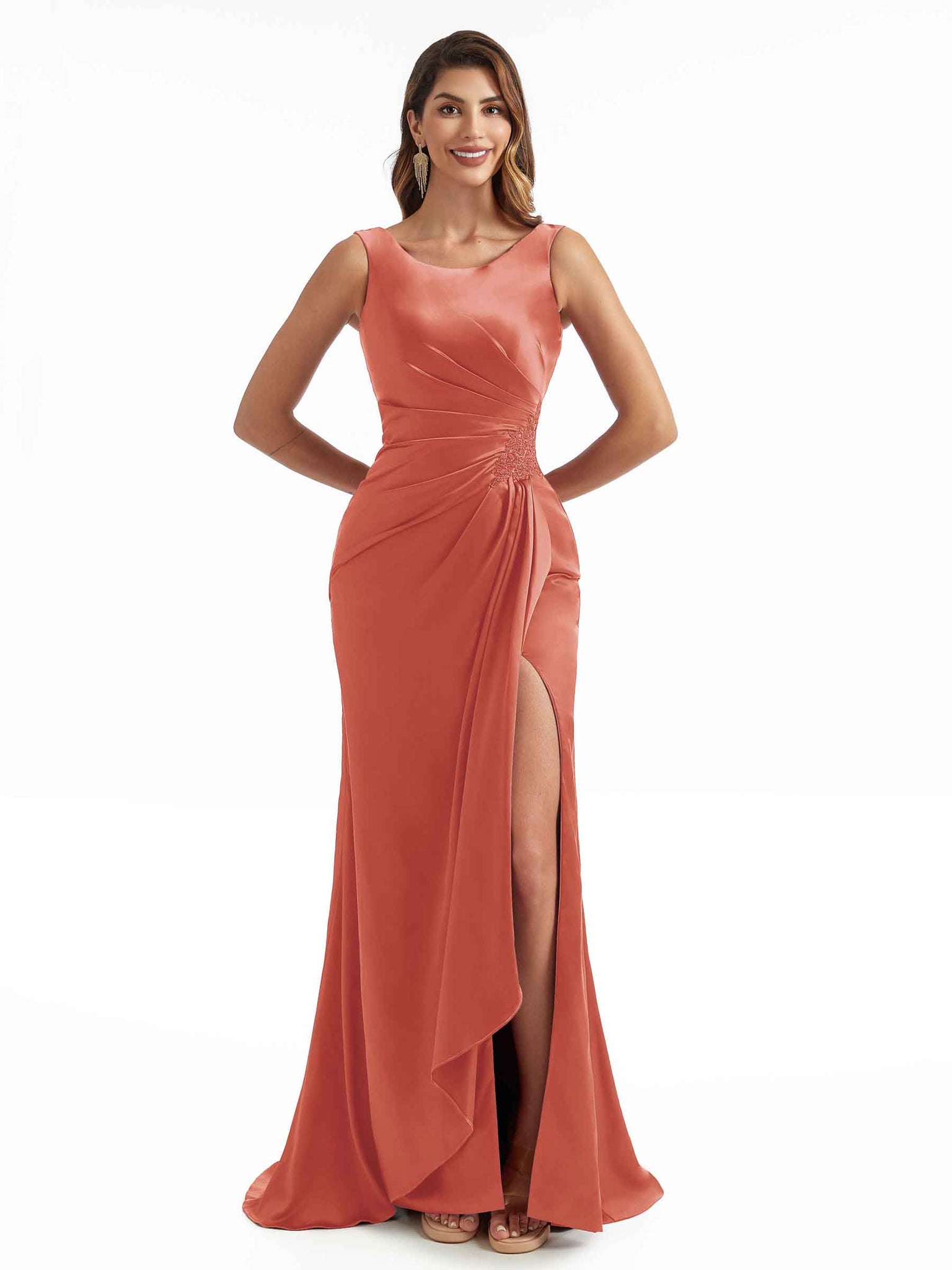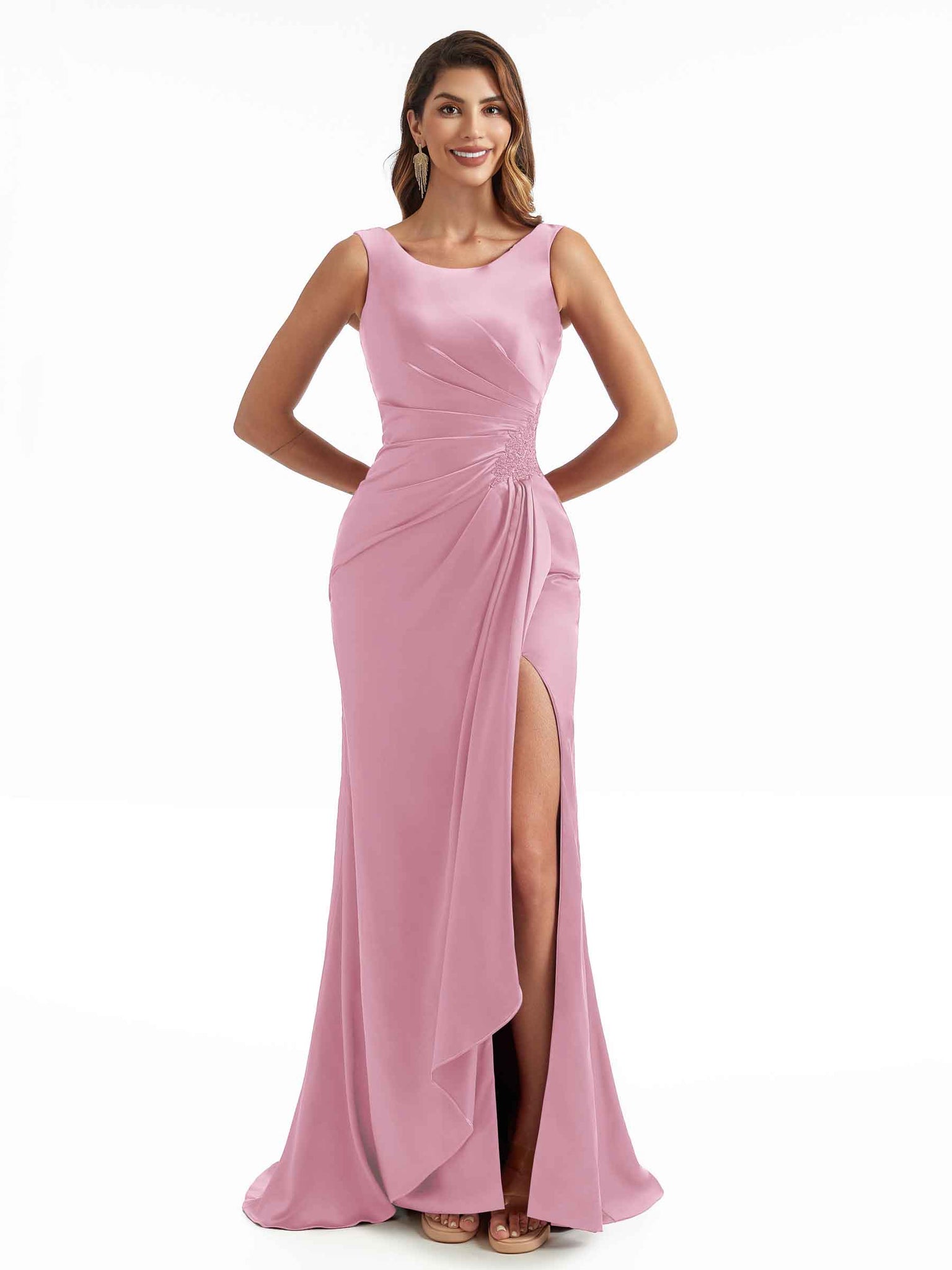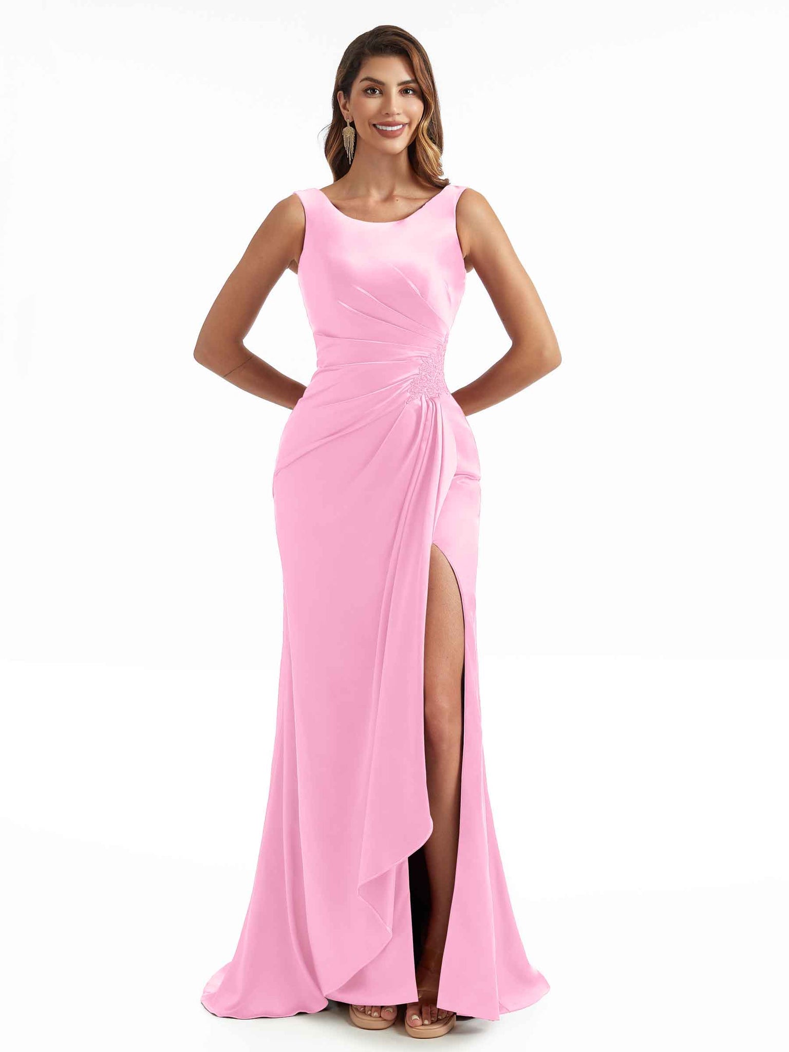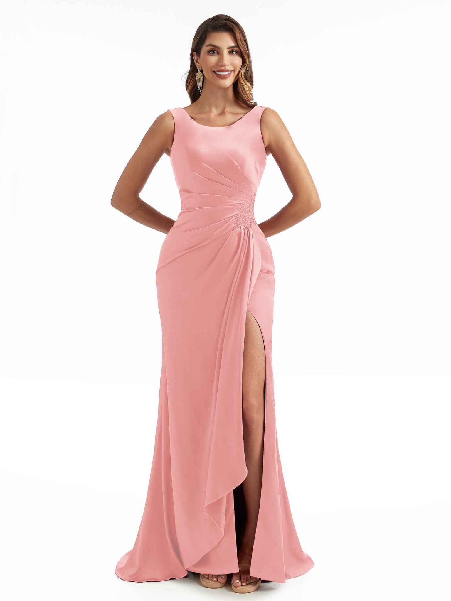 Women Scoop Sleeveless Side Split Long Satin Chic Formal Bridesmaid Dresses Online