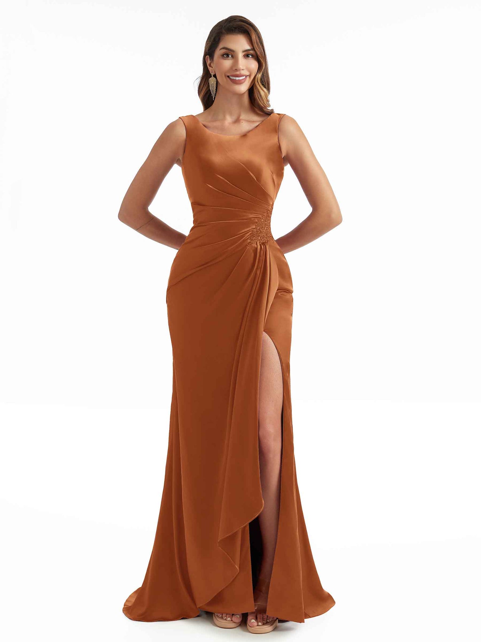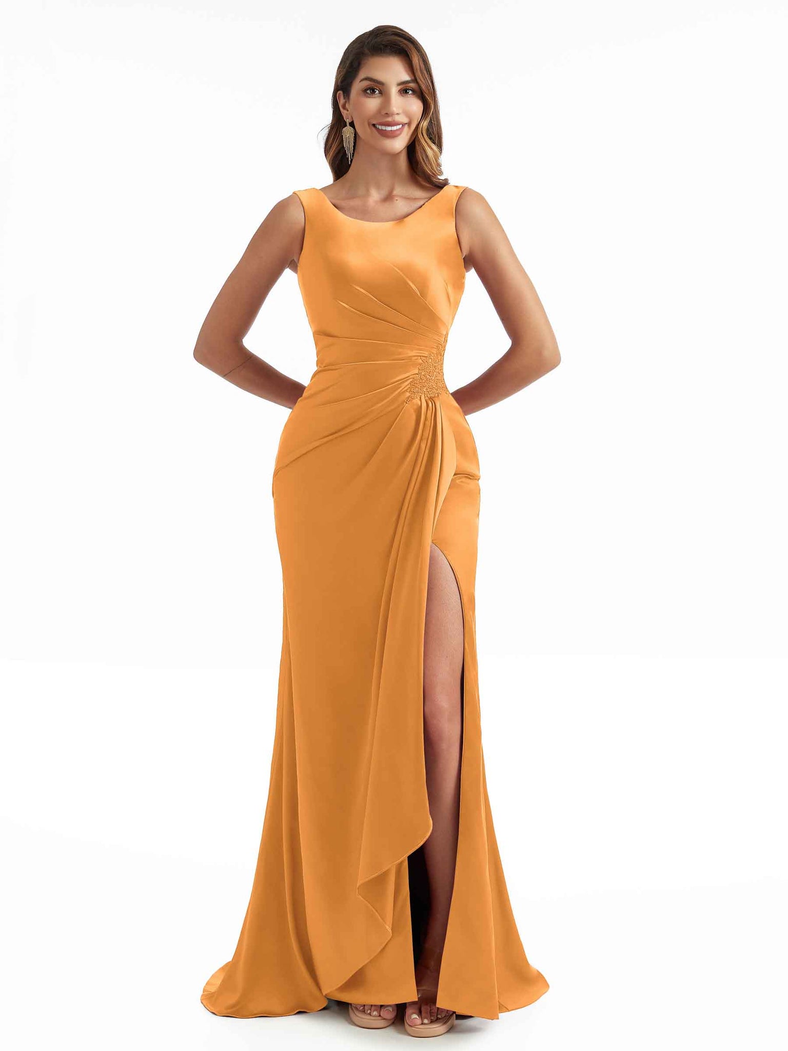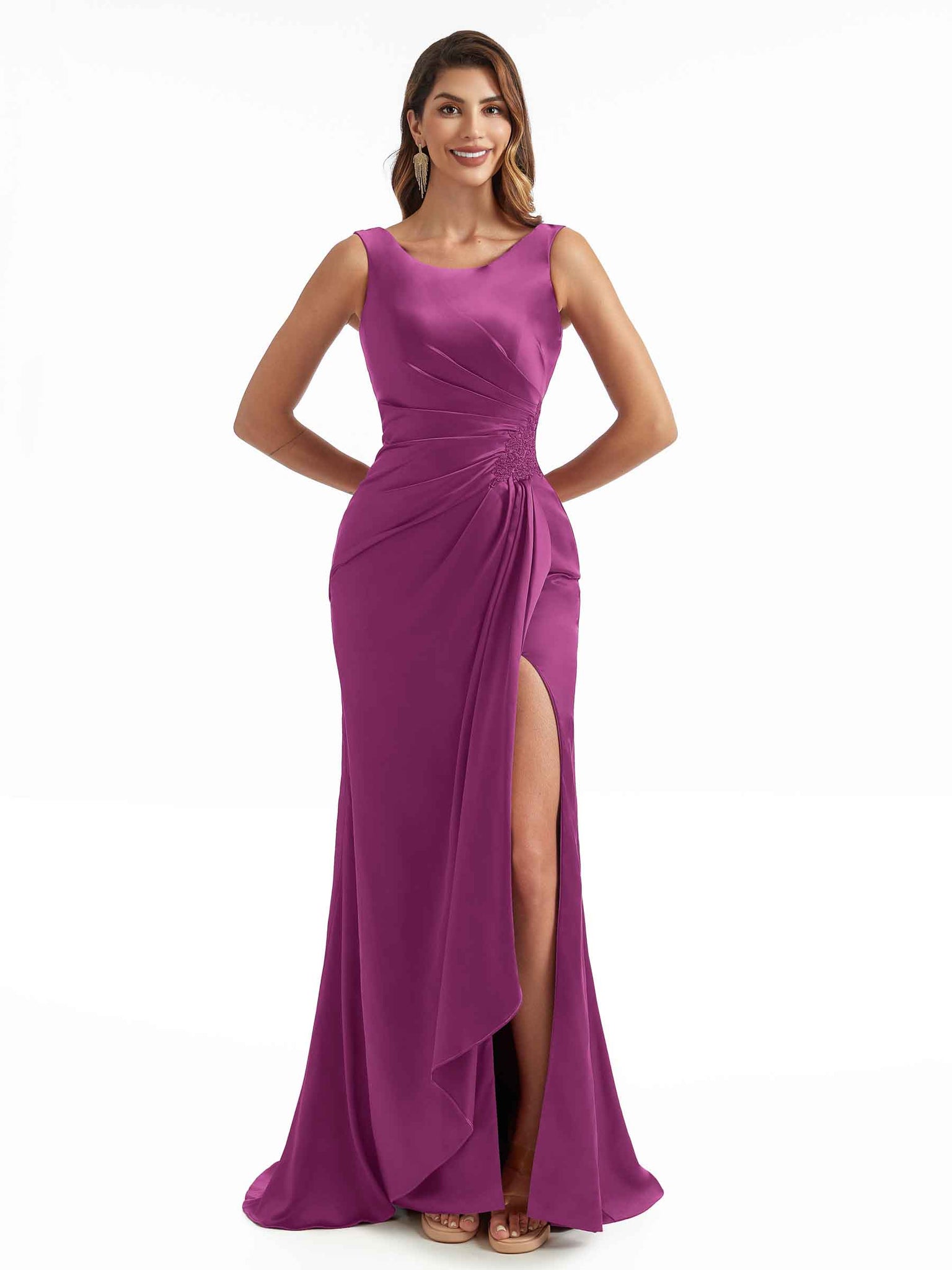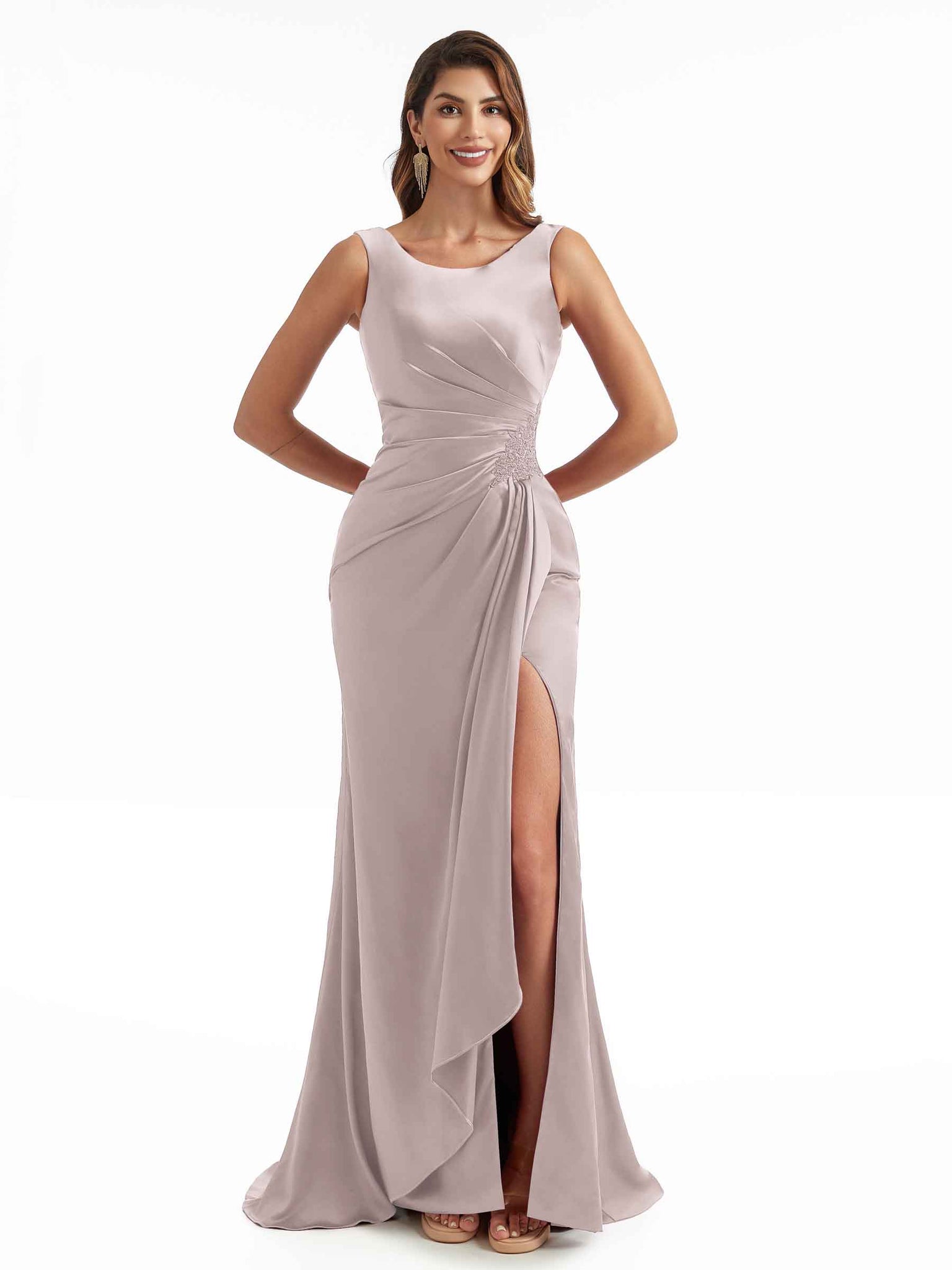 Women Scoop Sleeveless Side Split Long Satin Chic Formal Bridesmaid Dresses Online