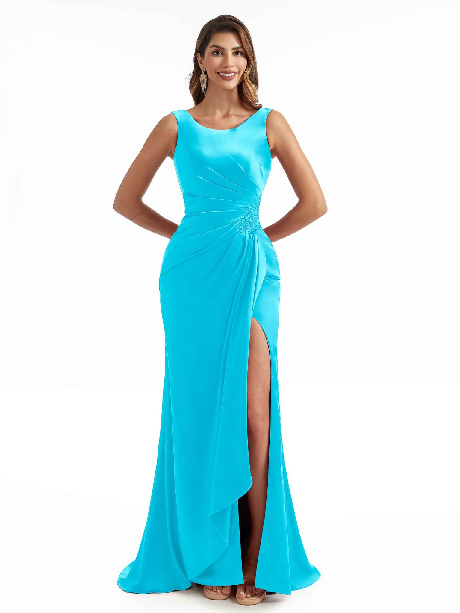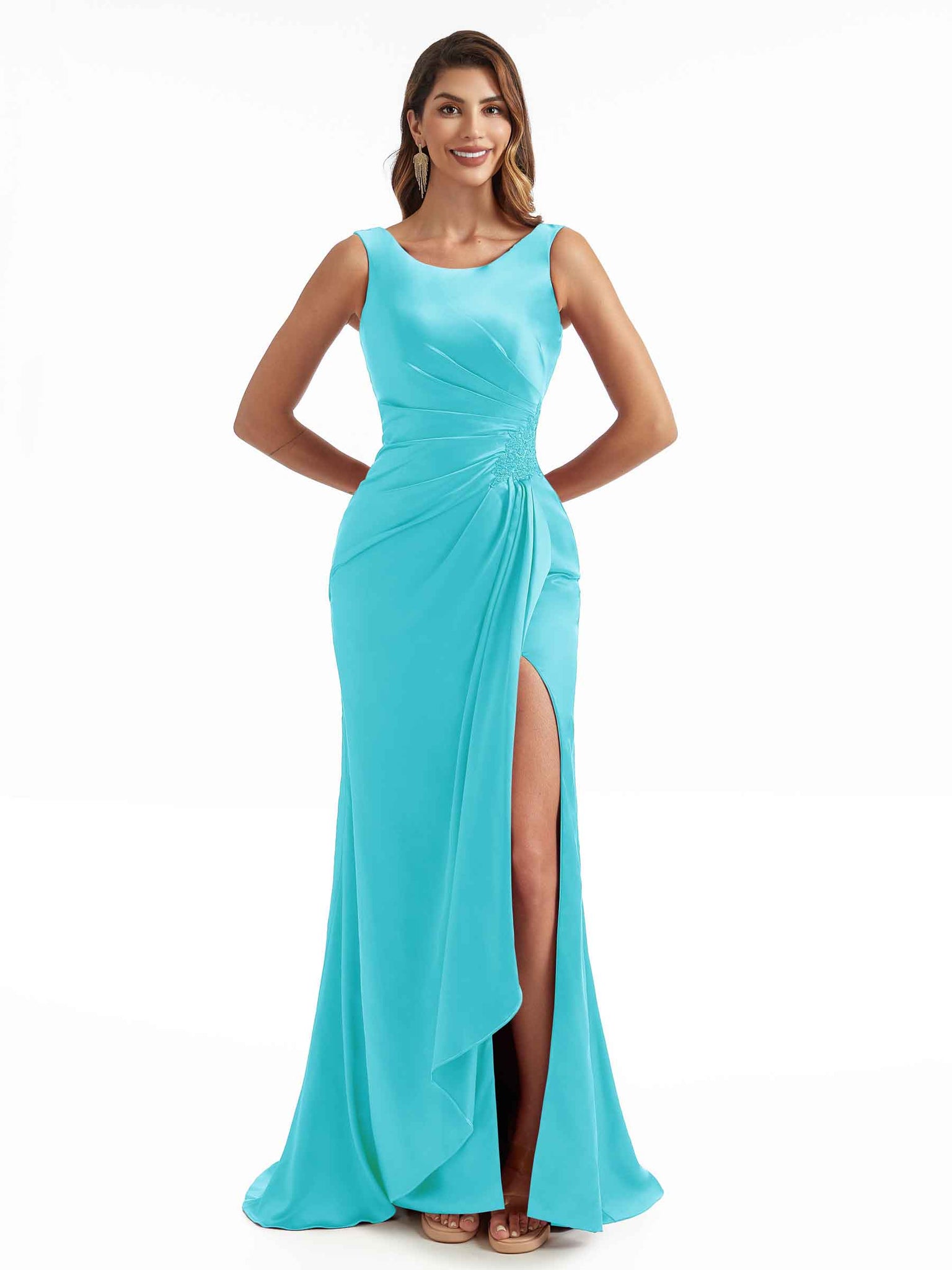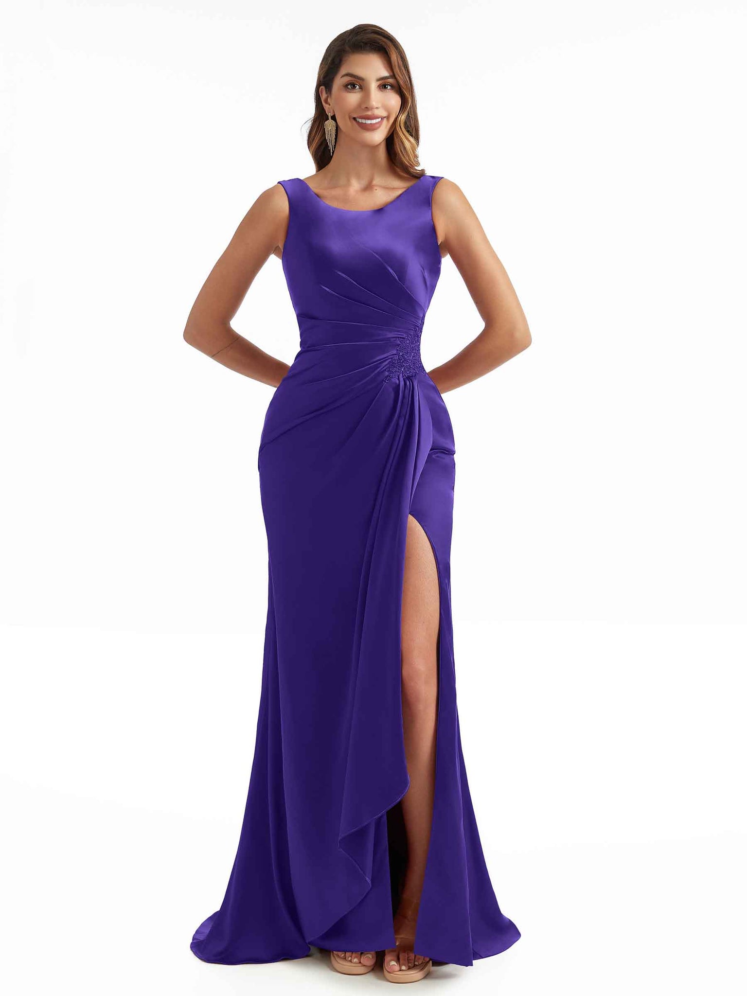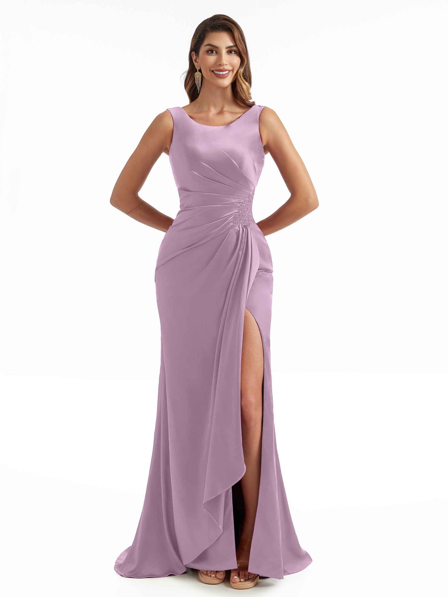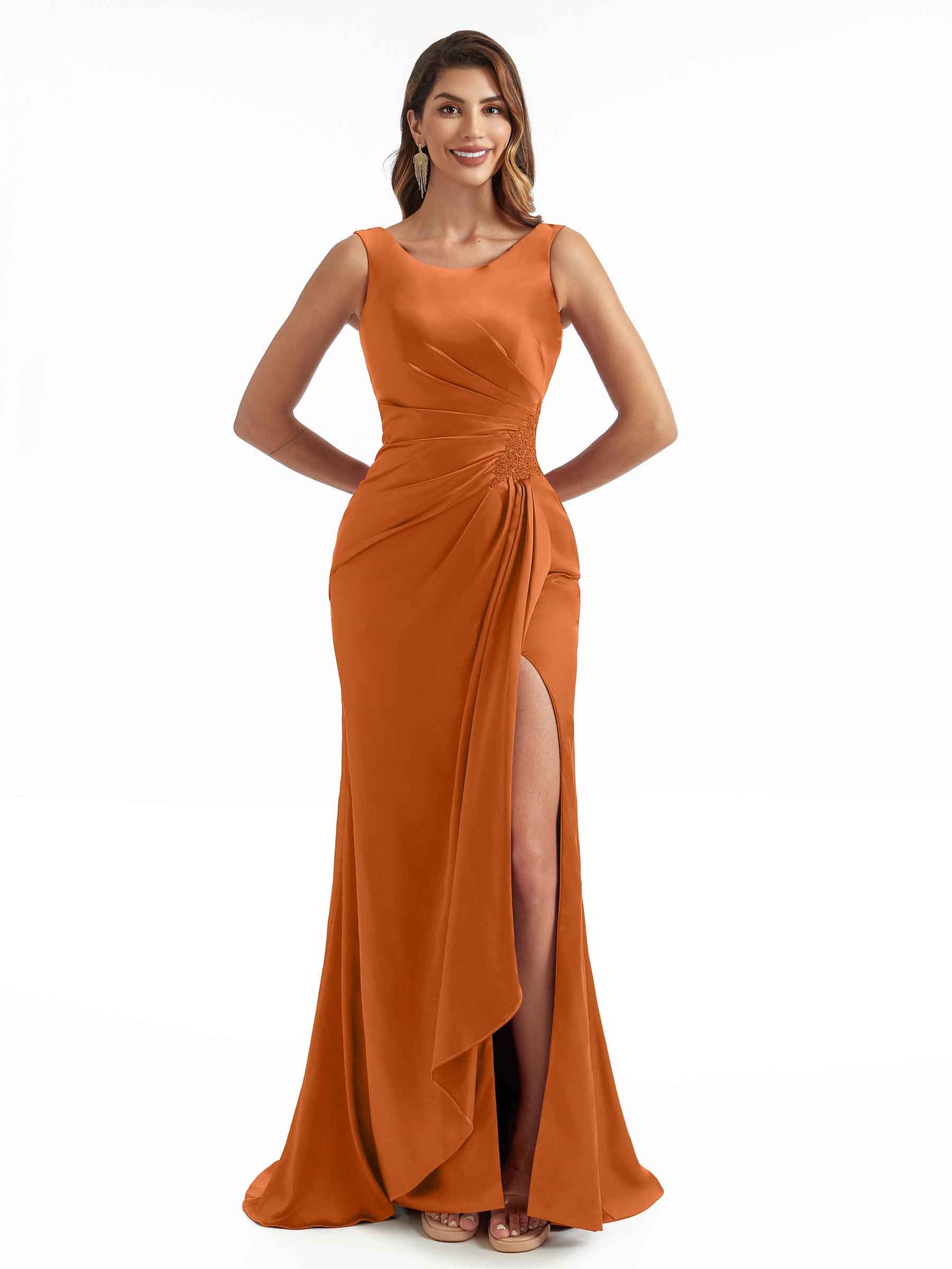 Women Scoop Sleeveless Side Split Long Satin Chic Formal Bridesmaid Dresses Online