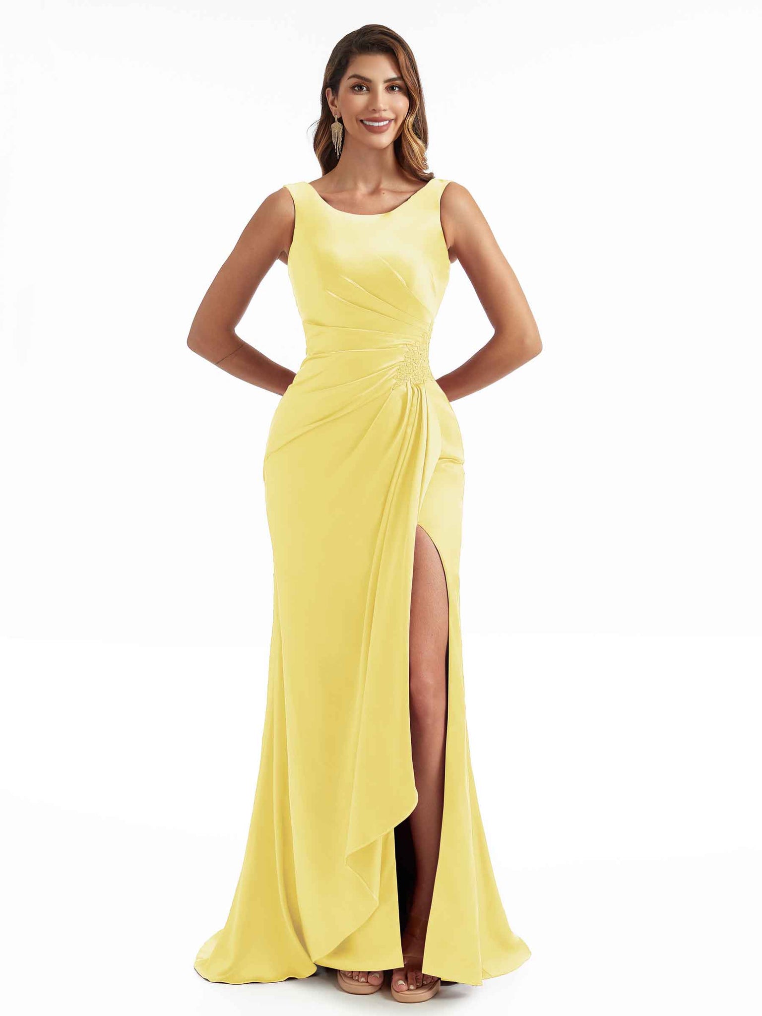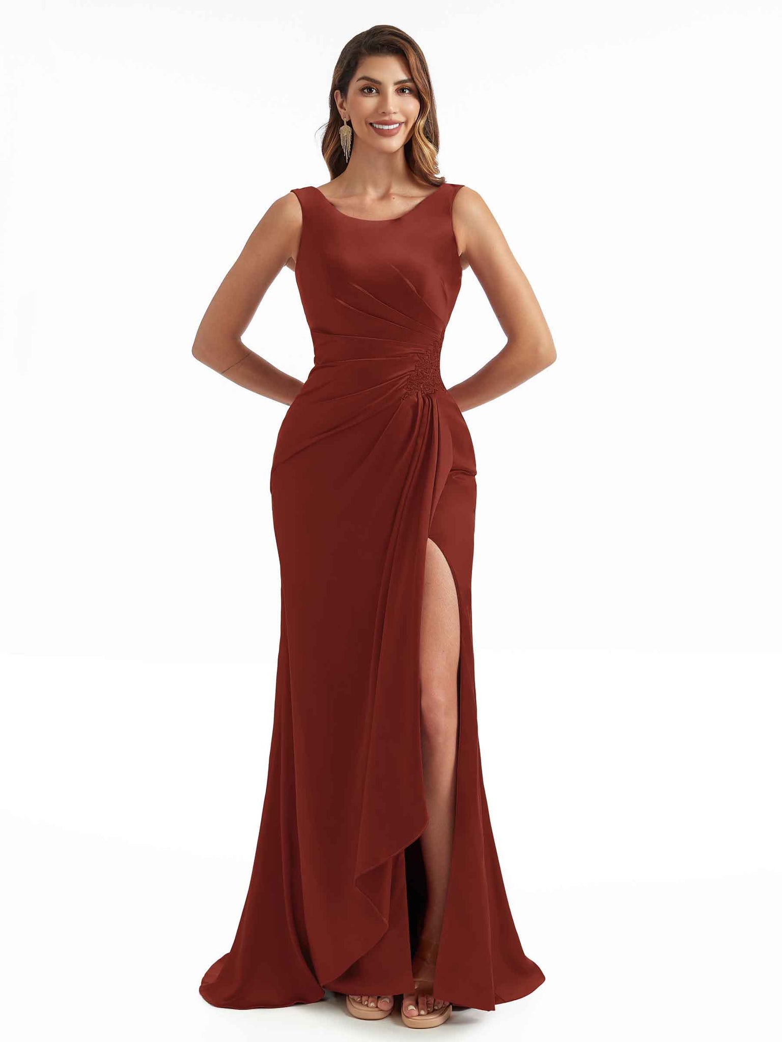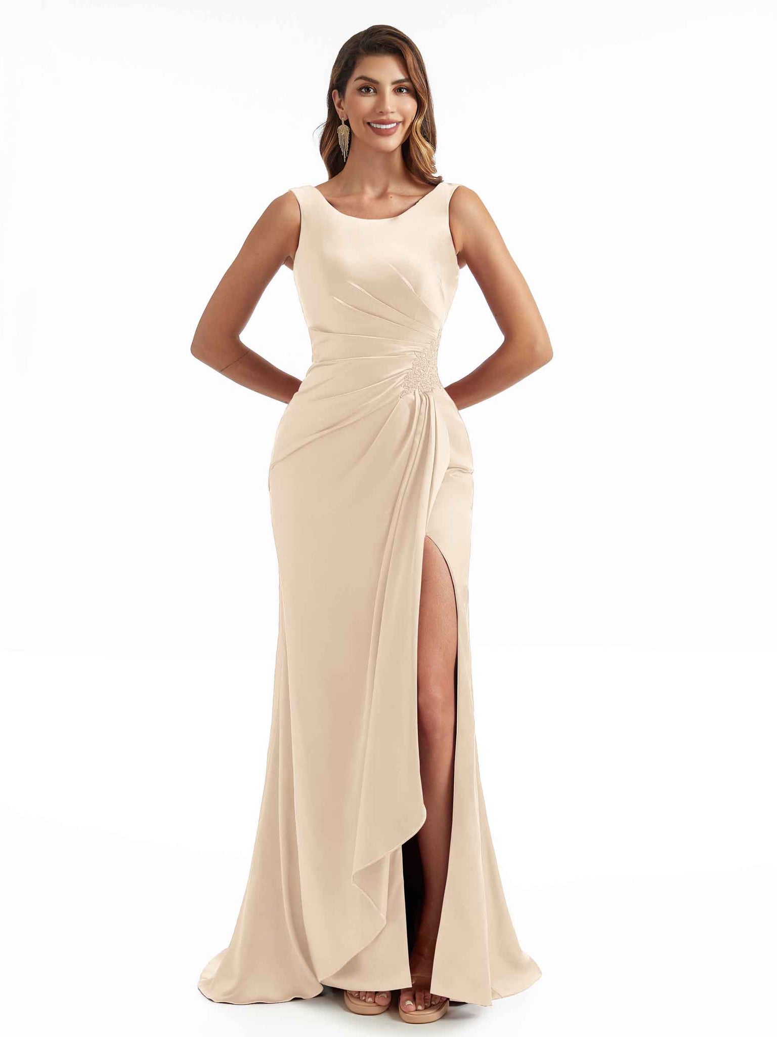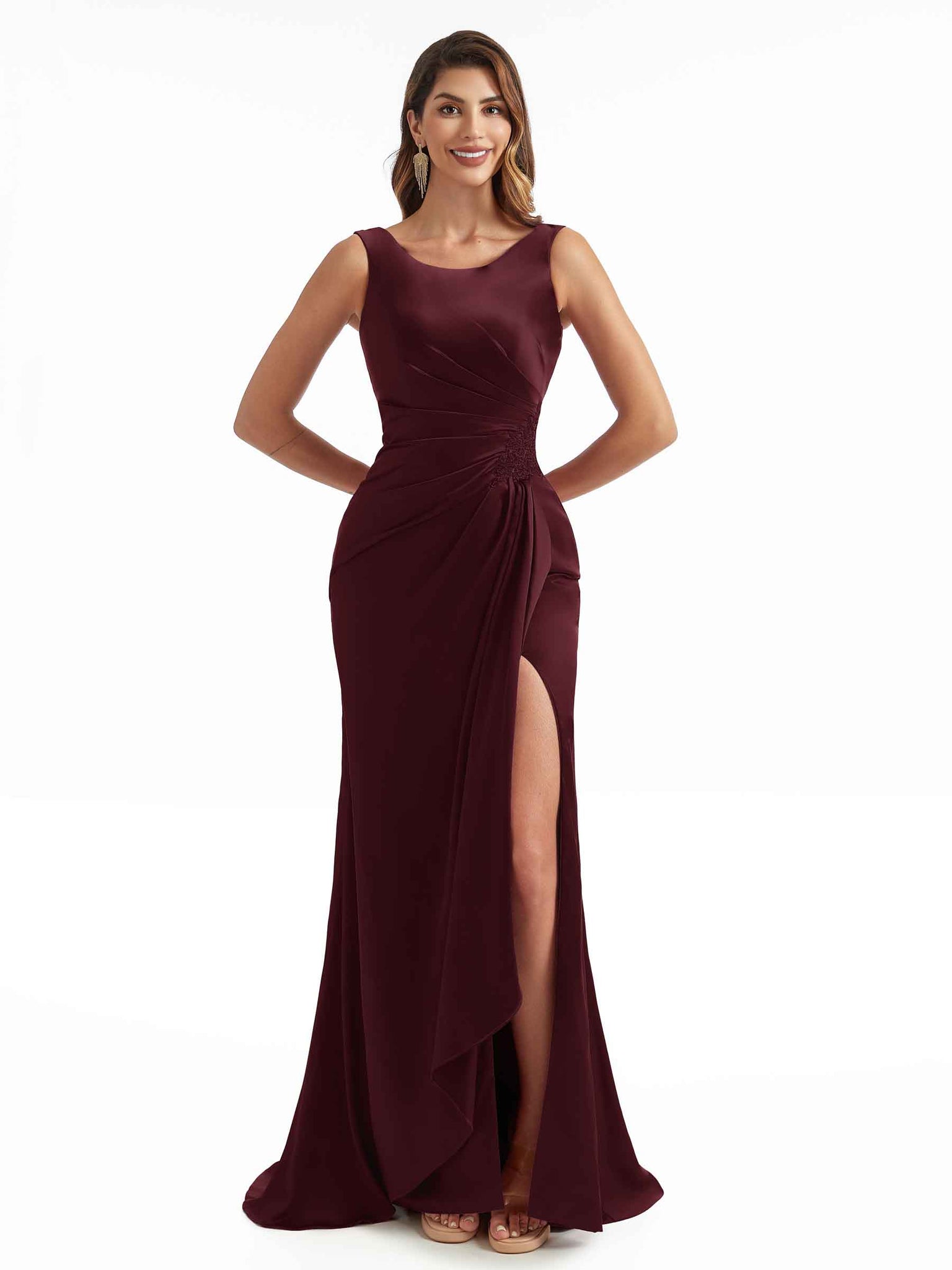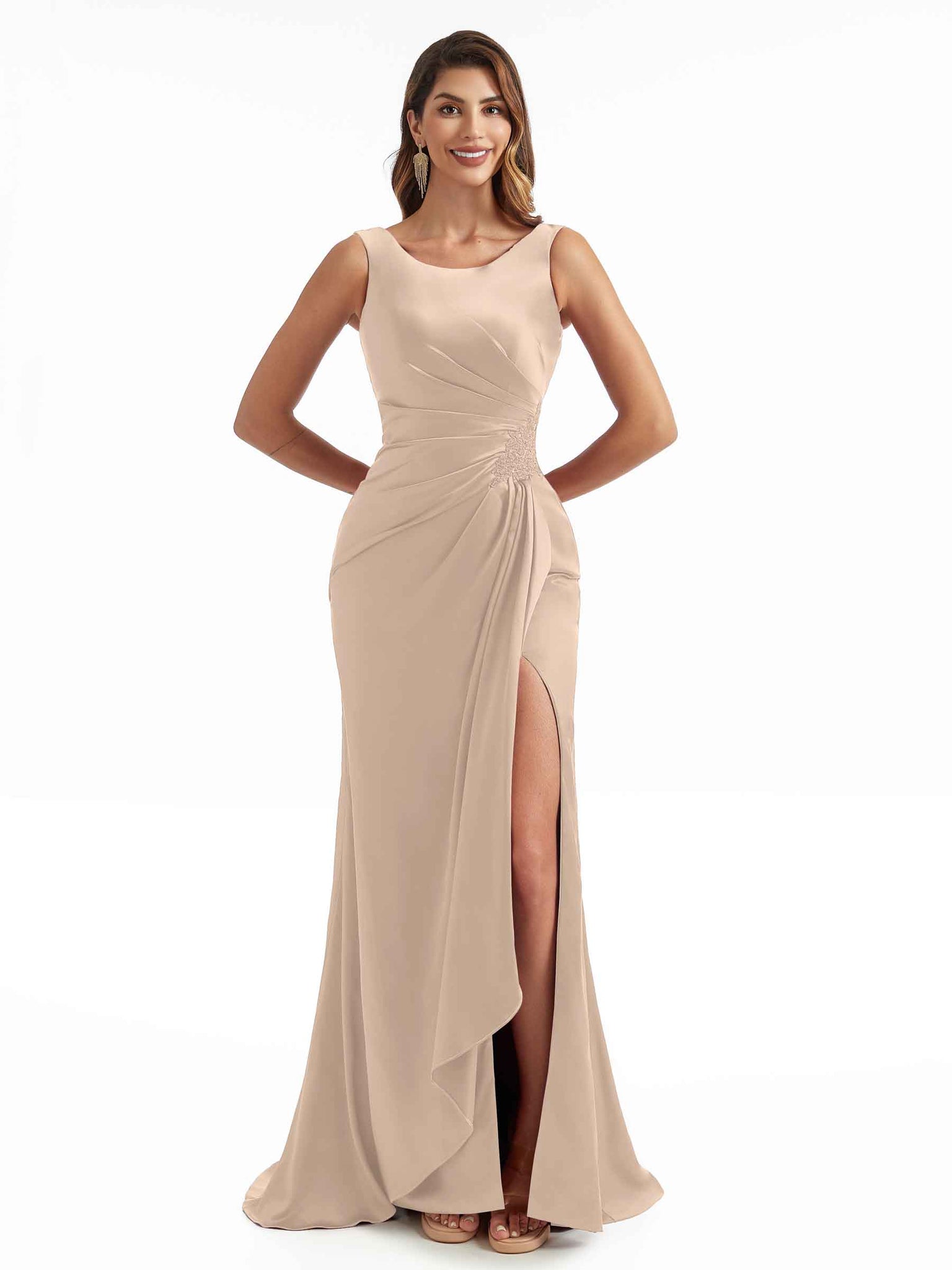 Women Scoop Sleeveless Side Split Long Satin Chic Formal Bridesmaid Dresses Online