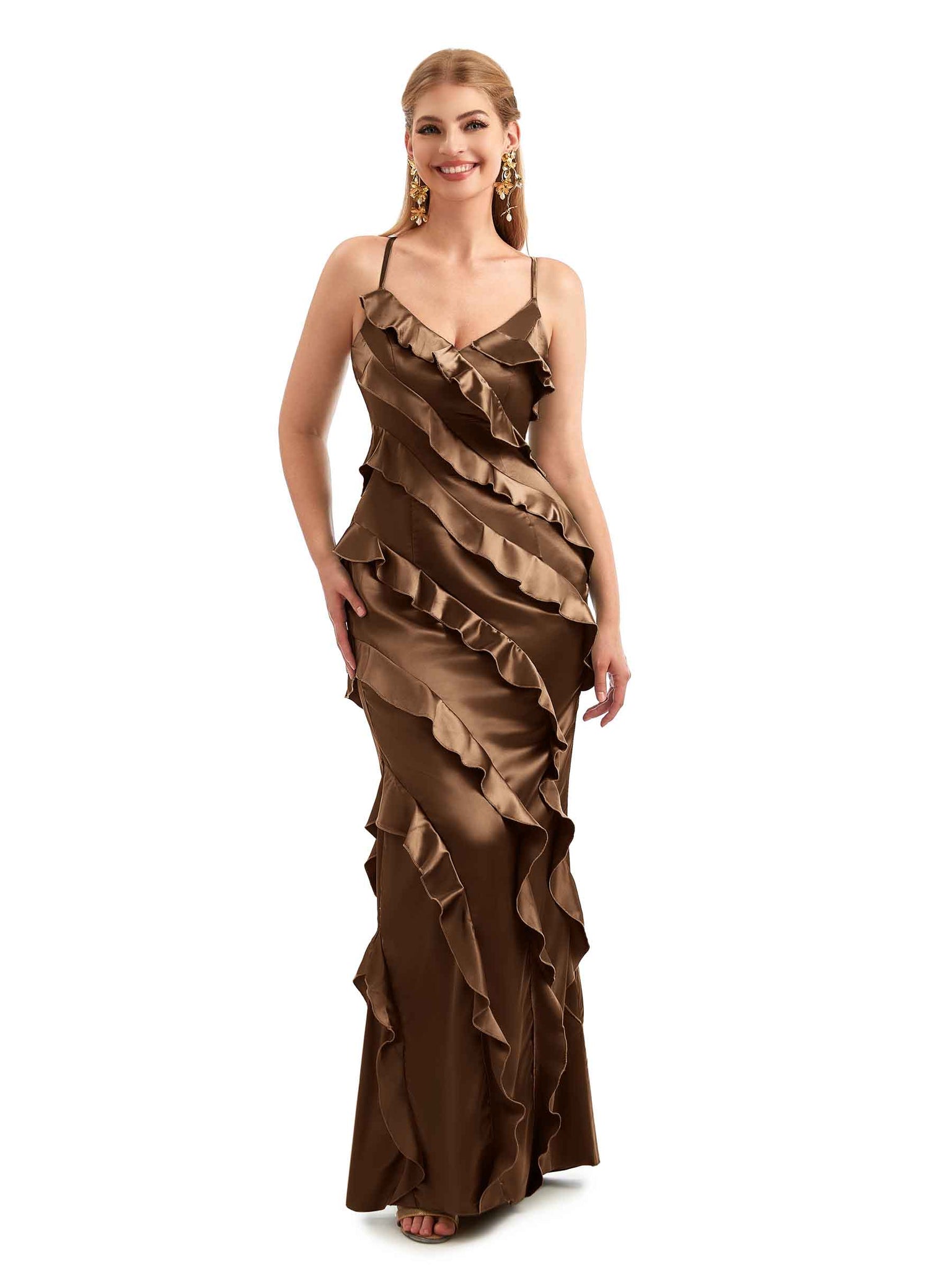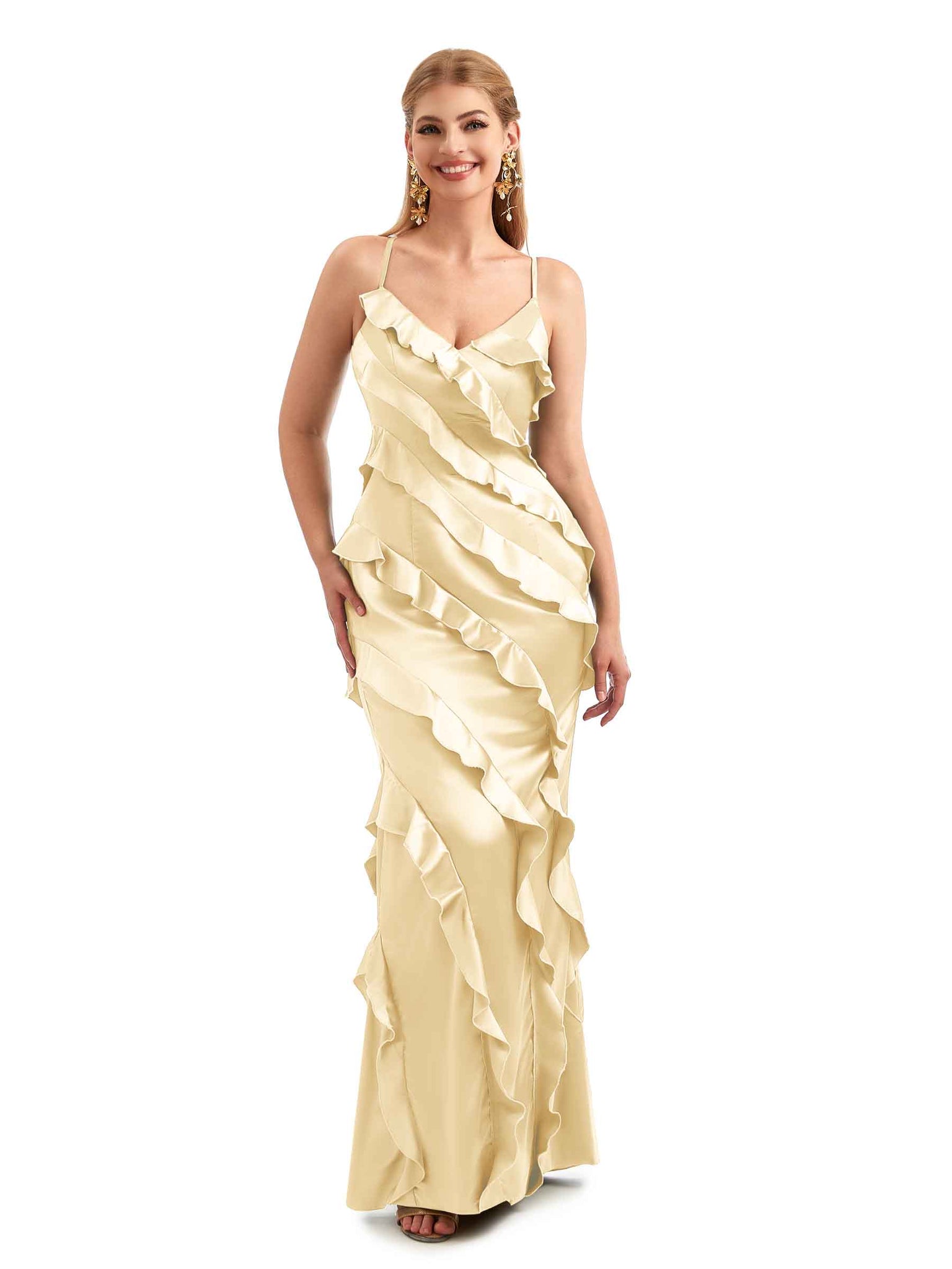 Women Spaghetti Straps Long Satin Ruffles Unique Formal Bridesmaid Dresses Online - ChicSew – ChicSew